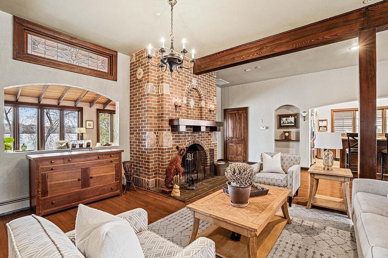 This inviting living room combines warmth and functionality, perfect for family gatherings. A stunning brick fireplace acts as the room’s centerpiece, surrounded by finely crafted wood accents and charming architectural details. The color palette features soft neutral tones complemented by the natural richness of dark wood. Plush seating invites relaxation, enhanced by textured throw pillows and a stylish area rug. Large windows flood the space with natural light, while unique stained glass offers a lovely touch of artistry. A rustic side table displays decorative plant life, fostering a connection with the outdoors, creating a cozy, welcoming atmosphere.