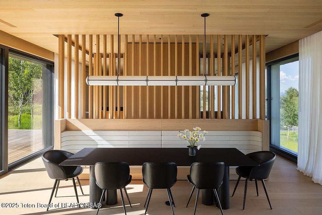 This dining area showcases contemporary elegance with its sleek lines and warm wooden accents. The spacious layout features a striking black dining table surrounded by a set of chic black chairs, creating a bold contrast against the light wood flooring and paneling. A unique wooden slatted partition enhances privacy while allowing natural light to filter through, adding a cozy yet open atmosphere. Large windows bring in views of the lush landscape, seamlessly integrating the indoors with nature outside. The minimalist yet functional design is perfect for family gatherings, encouraging both comfort and style in daily life.