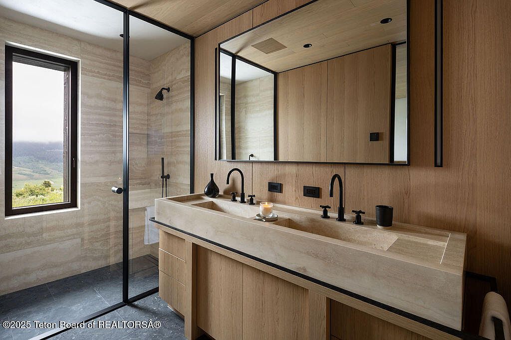 This contemporary bathroom features a sleek layout that combines functionality with style. The expansive vanity, crafted from natural wood, contrasts beautifully against the elegant stone countertop and black fixtures. A large mirror amplifies the light from the nearby window, enhancing the spacious feel while offering stunning views. A glass-enclosed shower showcases minimalist black hardware and a pebble floor, creating a spa-like atmosphere. Neutral tones dominate the color scheme, seamlessly integrating warmth and sophistication. Thoughtful design elements, such as ample storage and thoughtful lighting, ensure family-friendly usability, making this bathroom a perfect personal retreat.