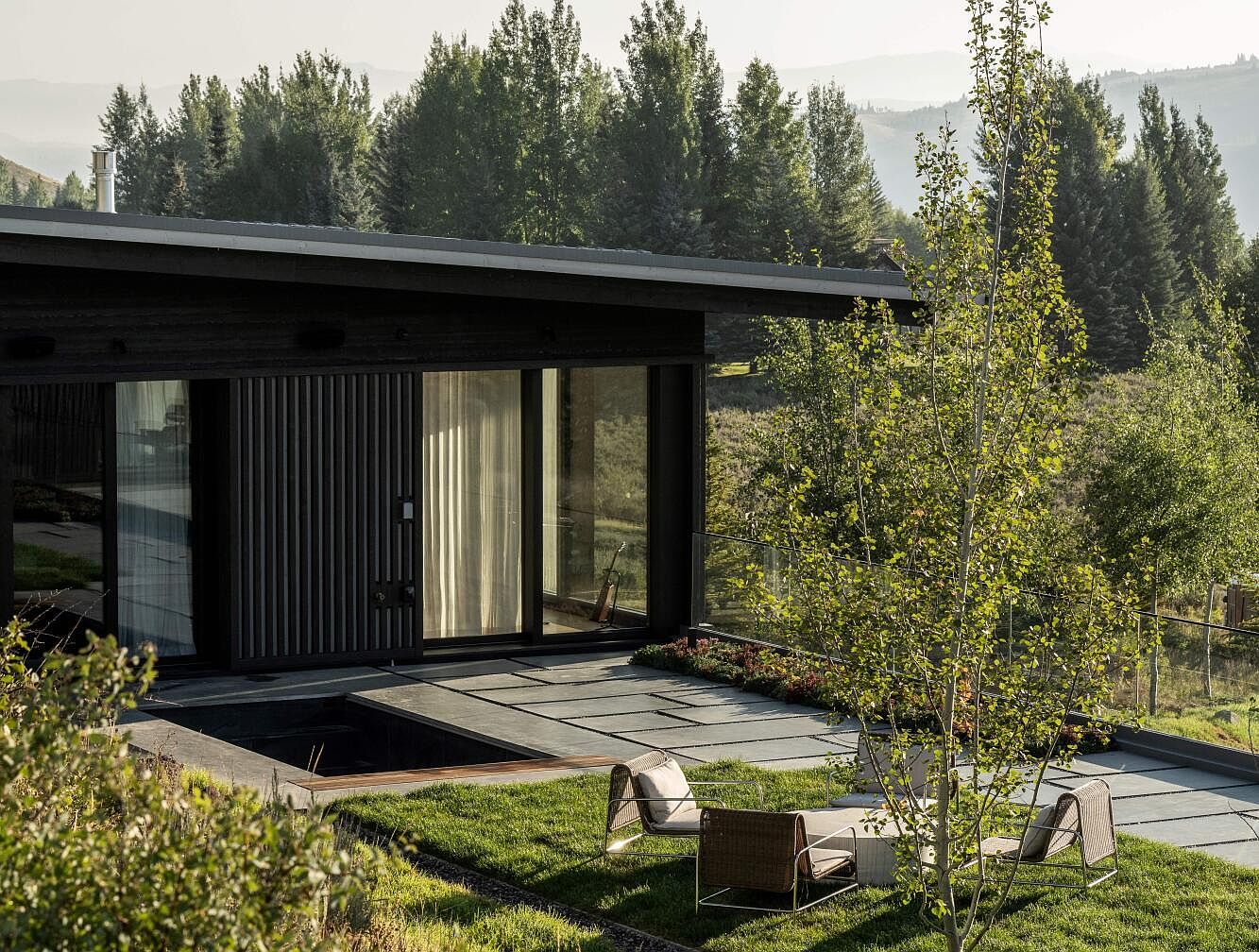 This stunning outdoor area exudes modern elegance, characterized by sleek lines and a beautifully curated garden. The design seamlessly integrates with nature, featuring expansive glass walls that invite natural light, offering panoramic views of the surrounding landscape. A cozy seating arrangement with contemporary chairs provides the perfect gathering spot for family and friends, enhancing the outdoor experience. The playful use of grassy areas intertwined with slate tiles echoes a harmonious connection to the environment, while vertical wood siding on the home adds depth and texture. This space embodies a relaxing yet stylish retreat, ideal for enjoying peaceful moments or lively gatherings.