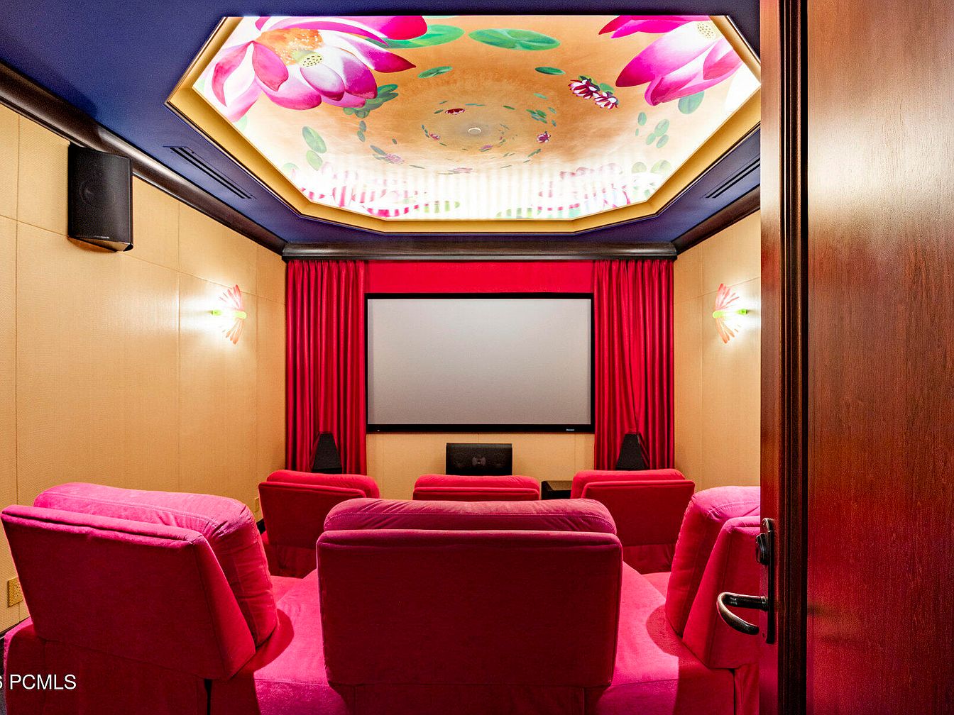 This vibrant home theater room features plush, deep red seating that invites comfort and relaxation for family movie nights. The unique coffered ceiling, adorned with a colorful floral mural, adds an artistic flair that enhances the room’s ambiance. Rich, textured wall panels complement the theatrical red drapes framing the screen, creating an immersive cinematic experience. State-of-the-art audio equipment is discreetly integrated, ensuring exceptional sound quality without distracting from the decor. Thoughtfully designed for family enjoyment, this space combines aesthetic beauty with functional features, making it the perfect retreat for entertainment and leisure.
