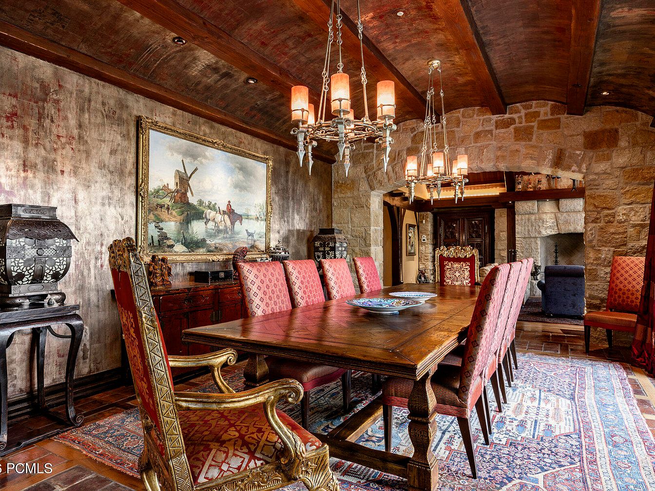 This elegant dining room blends rustic charm with sophisticated aesthetics. The grand wooden table, surrounded by intricately designed chairs, offers a central gathering point for family meals. A stunning chandelier hangs from the vaulted ceiling, illuminating the space with a warm glow. The walls feature a textured metallic finish, while a large antique painting adds character to the room. Rich, jewel-toned fabrics in the upholstery complement the earthy tones of the stone walls and wooden beams, creating a cohesive, inviting atmosphere. A classic Persian rug anchors the area, enhancing the room’s warmth and inviting elegance for every occasion.