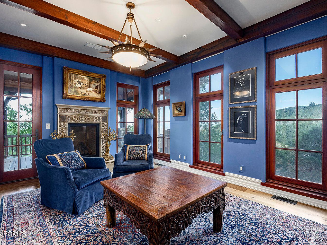 This inviting living room features a rich blue color palette complemented by warm wooden accents. Exposed beams run across the ceiling, adding a rustic charm to the space. Plush navy-blue armchairs with intricately patterned cushions provide comfort and style, while a large, ornate coffee table serves as a focal point, showcasing beautiful craftsmanship. The fireplace, framed by stunning silver detailing, creates a cozy atmosphere, perfect for gatherings. Expansive windows invite natural light and offer scenic views, enhancing the room’s open feel. Framed artwork adds character, making this a family-friendly space ideal for relaxation and entertainment.