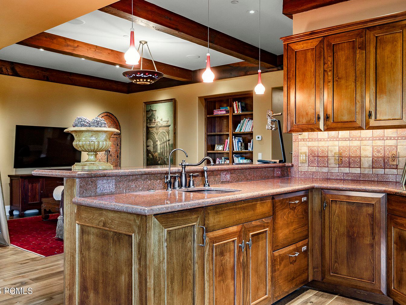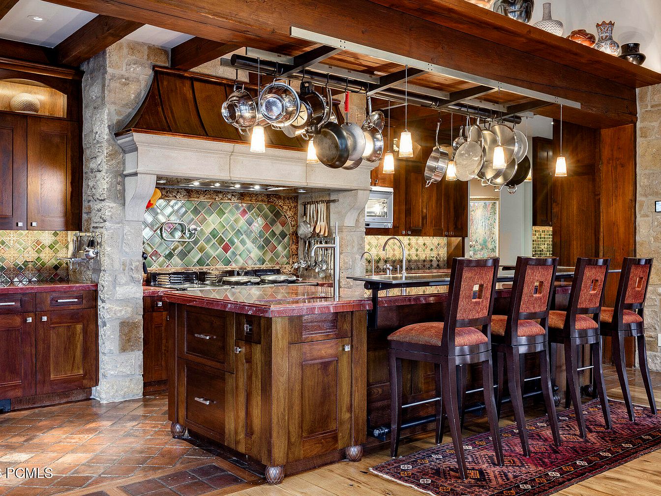 This stunning kitchen blends rustic charm with modern functionality, showcasing rich wooden cabinetry and stone elements that create a warm, inviting ambiance. The centerpiece is a large island topped with a polished countertop, providing ample space for meal preparation and casual dining. A pot rack above adds a practical yet stylish touch, while the colorful tiled backsplash introduces a playful complexity to the palette. Warm lighting illuminates the area, highlighting the intricate details of the cabinetry and the elegant barstools. Family-friendly features include a spacious layout and thoughtful design, making it ideal for gatherings and culinary adventures.