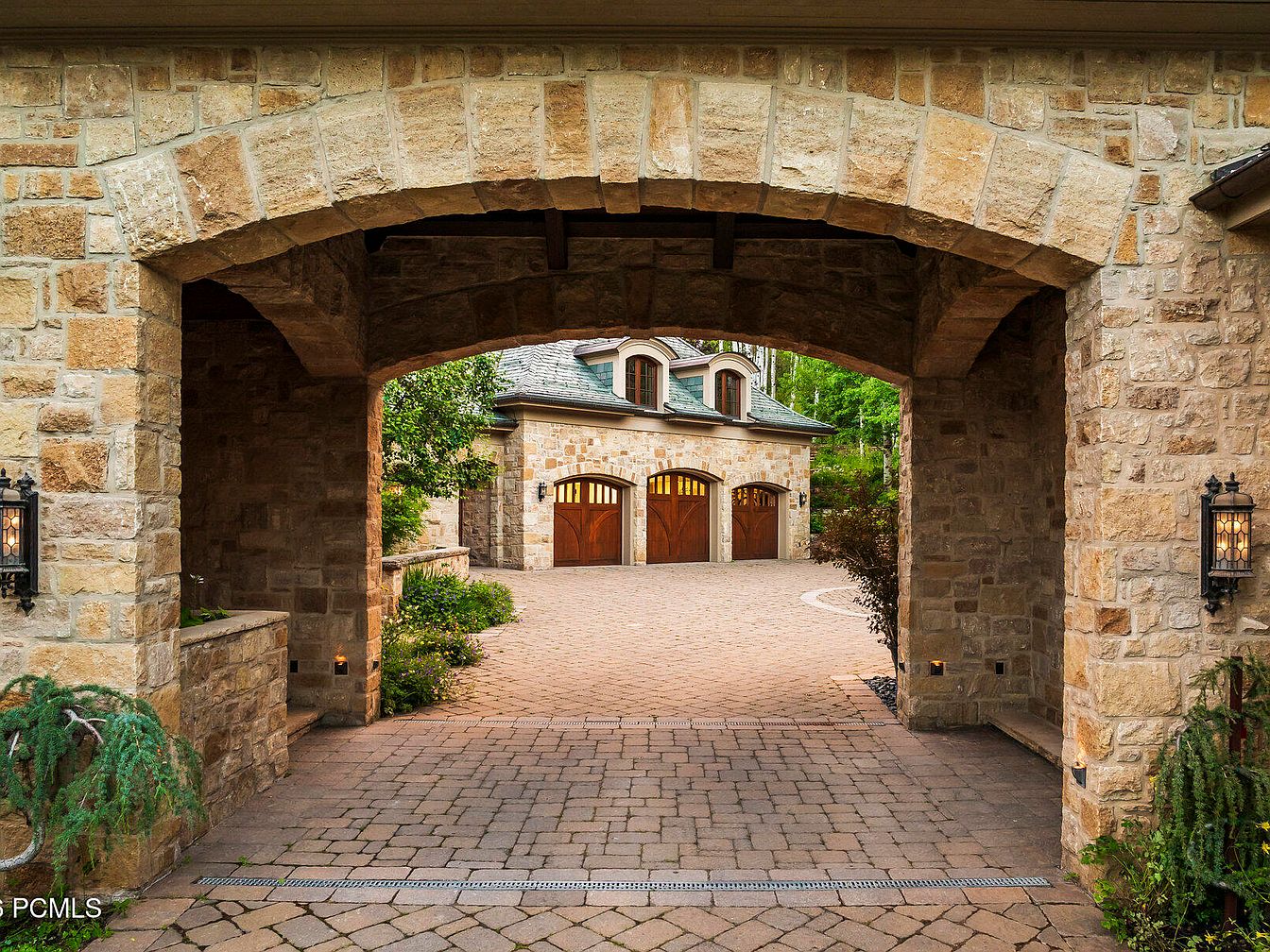 A stunning entryway features a grand stone arch, showcasing rustic charm that invites visitors into the home. Flanked by elegant lanterns, the archway leads to a picturesque driveway paved with warm-toned bricks, complemented by landscaped greenery. This architectural detail not only enhances curb appeal but also creates a sense of arrival. The thoughtfully placed plants and soft lighting add a welcoming touch, making it family-friendly. Beyond the arch, the charming garage with wooden doors and a sloping roof adds character. This entryway embodies sophistication while exuding a cozy, approachable atmosphere perfect for gatherings and everyday life.