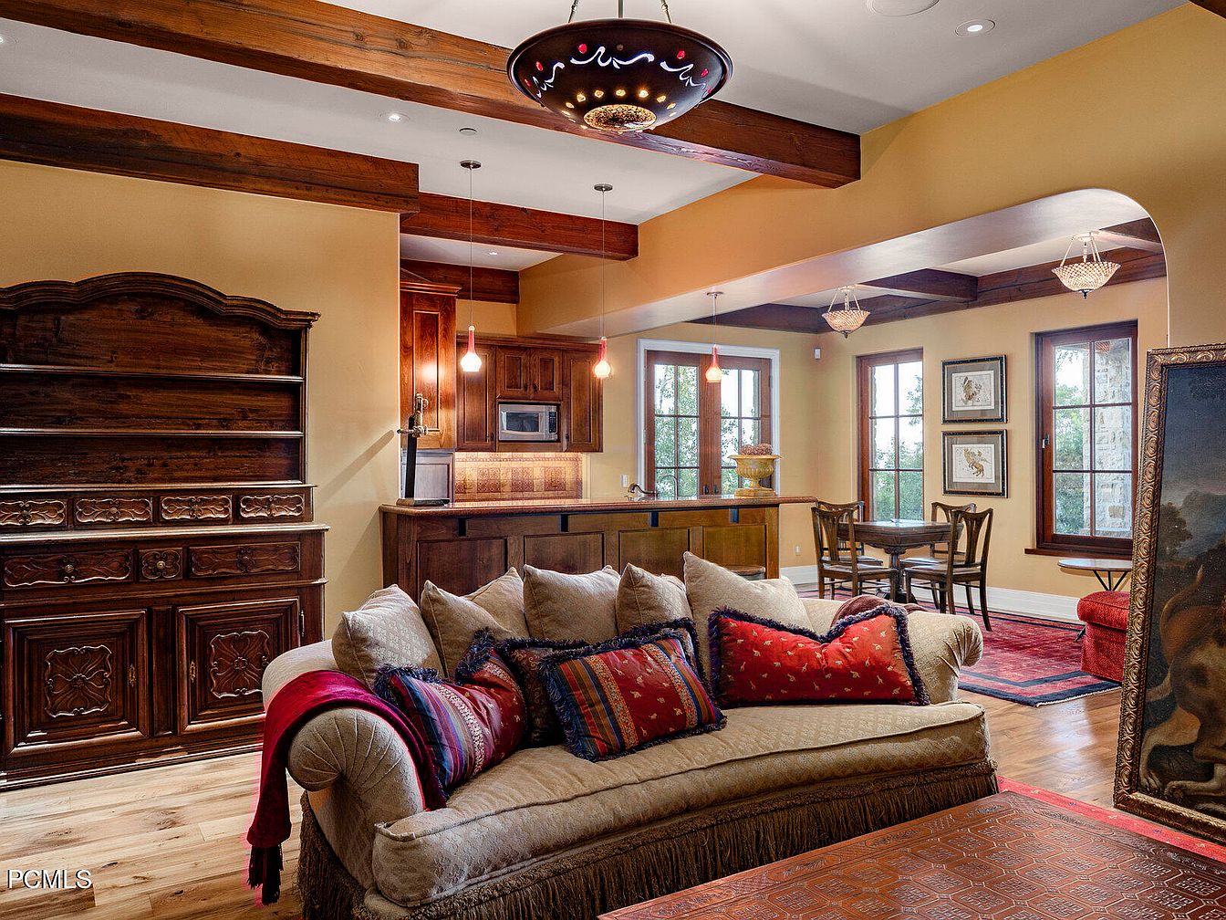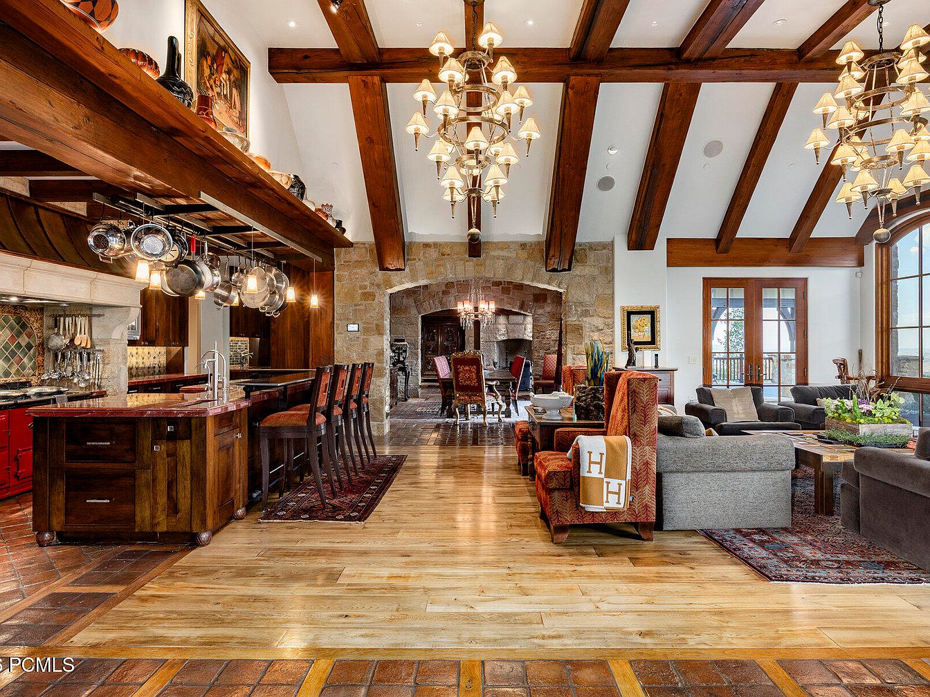 This spacious open concept living area seamlessly integrates the kitchen, dining, and relaxing spaces, promoting family gatherings. Exposed wooden beams lend a rustic charm, accentuated by the warm tones of the hardwood flooring and rich cabinetry. The kitchen showcases elegant red accents, with a large island that provides both function and style, ideal for informal dining. Plush seating options, including a cozy sectional and unique accent chairs, create inviting nooks for conversations. The elegant lighting fixtures illuminate the space, while large windows bring in natural light and stunning views, emphasizing comfort and sophistication.