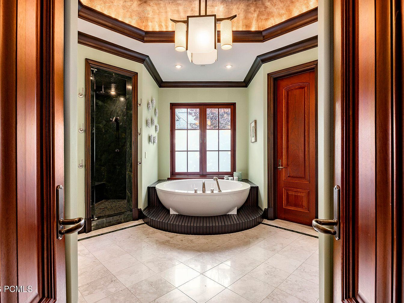 This beautifully designed bathroom features an inviting, freestanding tub elegantly situated against a backdrop of large windows that flood the space with natural light. Rich hardwood accents contrast perfectly with the soft green walls, creating a serene and cozy atmosphere. Marble floors enhance the luxurious feel, while the dark, modern shower area offers a stunning visual juxtaposition. Architectural details like the coffered ceiling and ornate light fixture lend a hint of sophistication. The ample storage and well-thought-out layout make it not just a space for relaxation, but also a practical family-friendly retreat.