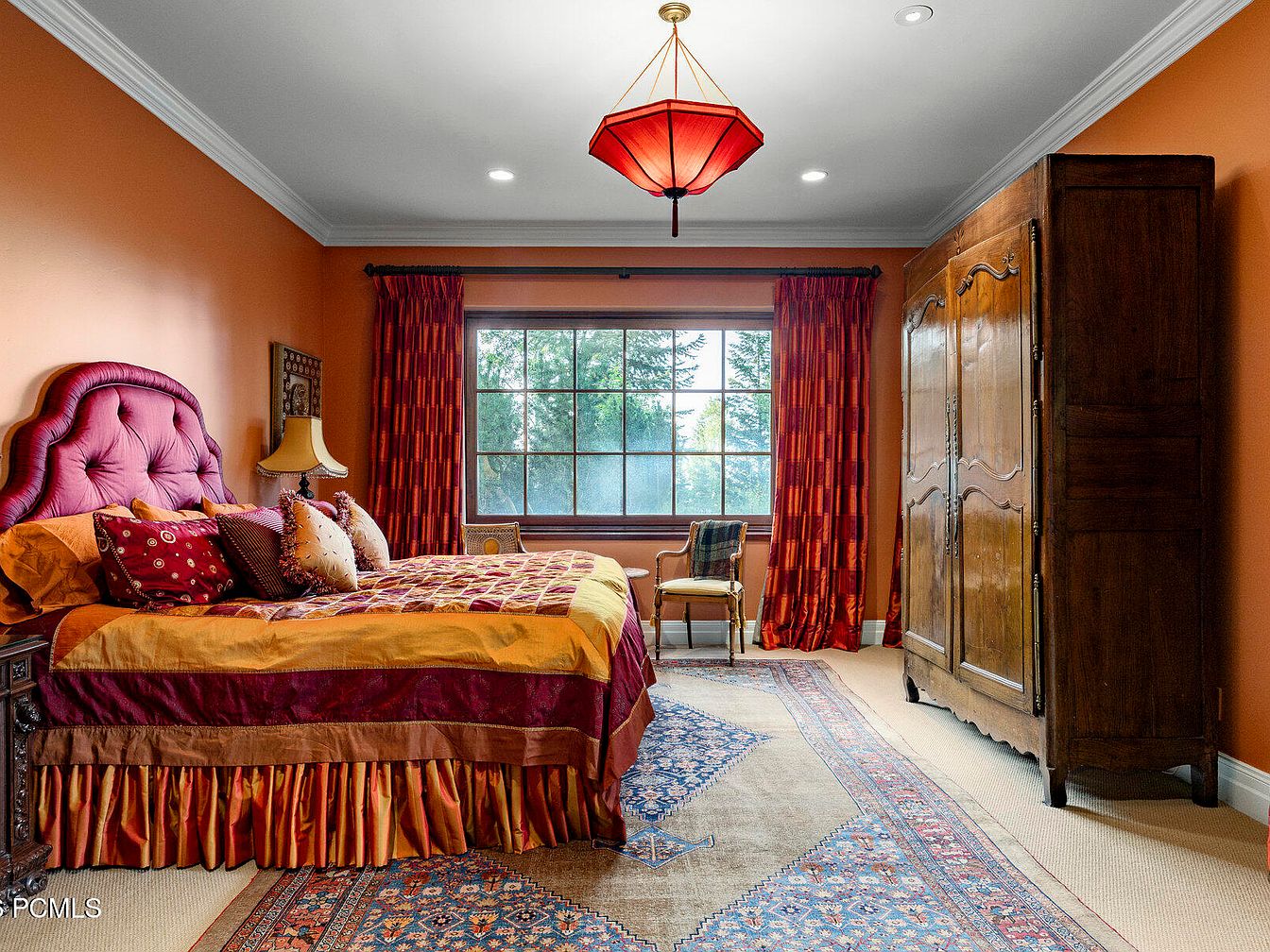 This inviting bedroom features a bold and vibrant color scheme, with warm orange walls that create a cozy atmosphere. The centerpiece is a luxurious king-sized bed adorned with an eclectic mix of rich fabrics in burgundy, gold, and deep purple, accented by decorative pillows. Tall, patterned drapes frame a large window that opens to scenic views, bringing natural light into the space. An antique armoire complements the traditional design, adding character, while a plush area rug centers the room, enhancing its warmth. Cozy seating by the window invites relaxation, making it a perfect family-friendly retreat.