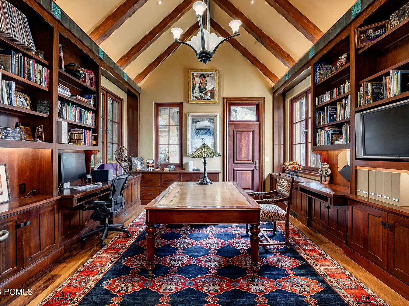 This inviting home office features high vaulted ceilings adorned with exposed wooden beams, creating an airy and spacious feel. Deep mahogany cabinetry lines the walls, showcasing an array of books and personal mementos. A central desk, elegantly crafted, stands atop a vibrant area rug with intricate patterns, adding warmth to the hardwood floor. Large windows frame the room, allowing natural light to flood in, brightening the workspace. A comfortable upholstered chair complements the desk, while additional seating invites relaxation. Thoughtfully designed for productivity and comfort, this cozy office blends functionality with timeless aesthetics.