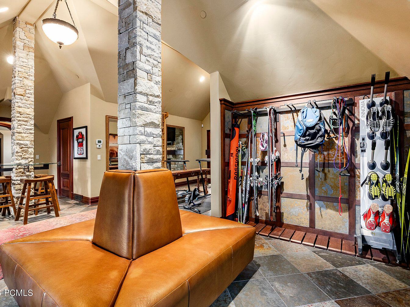 This ski room combines functionality and comfort, featuring a striking layout that welcomes family and friends. The focal point is a unique leather seating area, perfect for après-ski relaxation. Tall stone pillars enhance the rustic charm, while the rich color palette of warm browns and earthy tones creates a cozy atmosphere. The space is practical with dedicated storage for skiing gear, including skis and backpacks, ensuring organized access for outdoor enthusiasts. Large windows allow natural light to flood in, accentuating the exquisite stonework and high ceilings, making it an inviting hub for winter adventures.