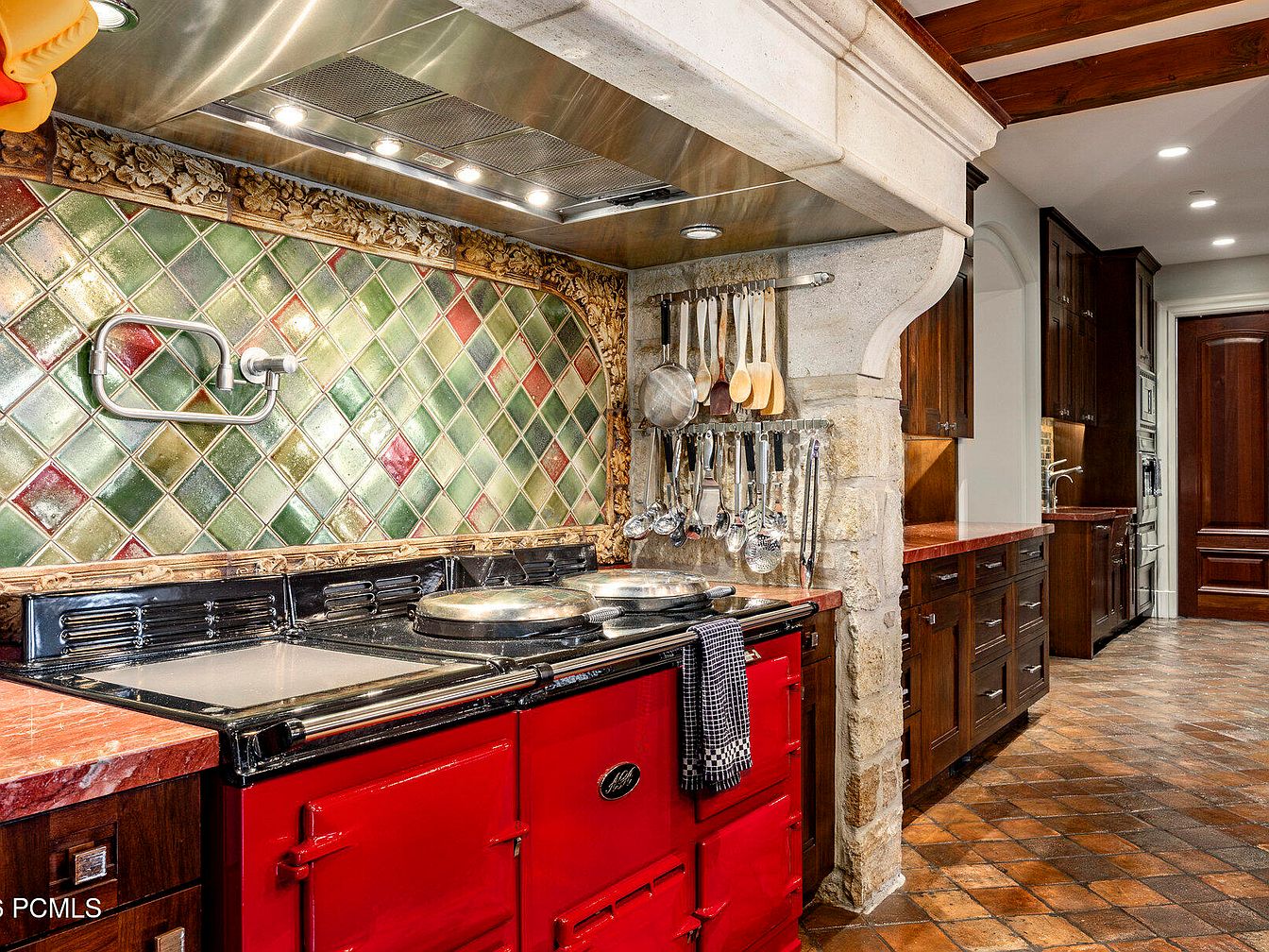 This stunning gourmet kitchen features an elegant mix of rustic and modern aesthetics. The centerpiece is a bold red vintage stove, complemented by a rich array of natural materials, including a dark wooden cabinetry and a striking stone archway. The backsplash, adorned with handcrafted, colorful tiles, adds a unique charm, with hues of green and red that evoke a warm ambiance. Spacious countertops made from warm stone invite culinary creativity, while meticulously organized hanging utensils reflect a family-friendly design. The rich, earthy tones of the floor tiles harmonize beautifully with the overall layout, making this kitchen the heart of the home.