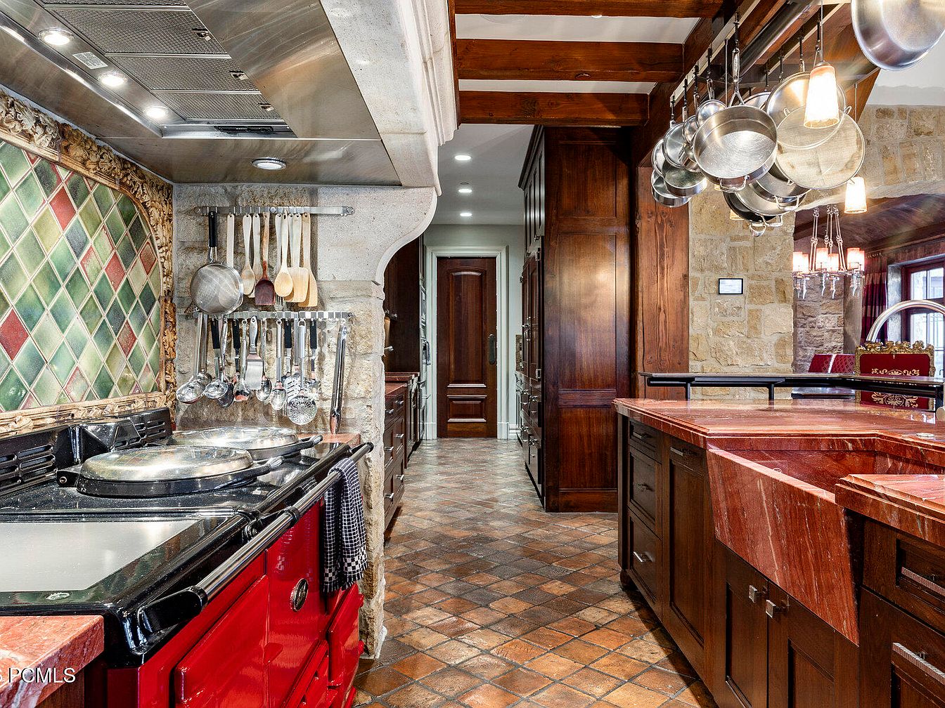This inviting chef’s kitchen blends rustic charm with modern functionality. The striking red stove stands out against the rich wooden cabinetry and intricately patterned tiled backsplash, featuring a harmonious mix of earthy greens and muted reds. A spacious layout facilitates easy movement, while hanging pots and utensils keep essentials within reach, promoting a family-friendly cooking experience. The warm tones of the stone flooring complement the wooden beams overhead, adding depth to the space. Ample counter space, adorned with luxurious marble, enhances both aesthetics and utility, making this kitchen perfect for gatherings and culinary adventures.