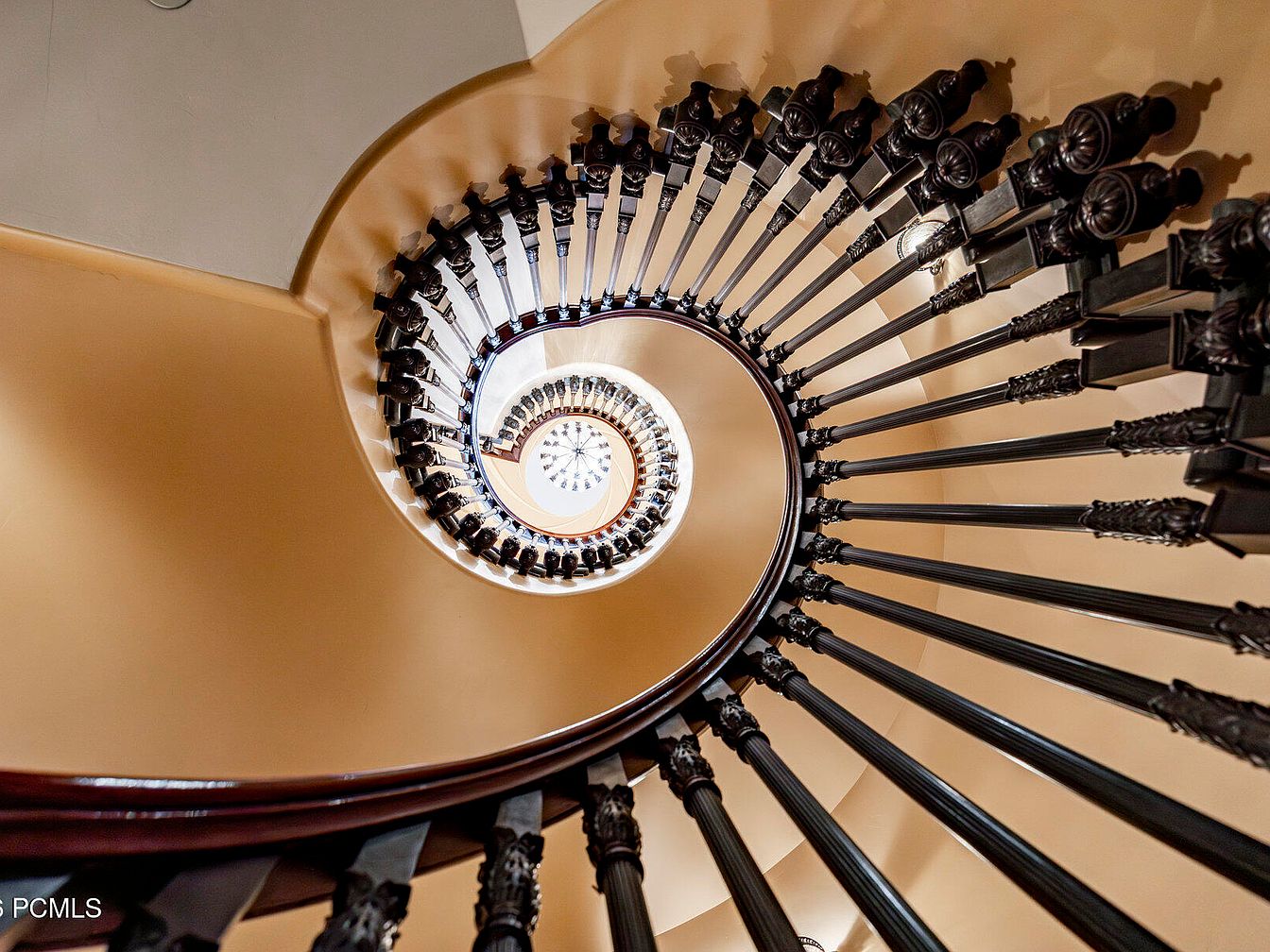 This stunning spiral staircase serves as a captivating centerpiece in a luxurious American home. Crafted with a rich wooden handrail, the staircase transitions into an intricate black wrought iron balustrade, showcasing exquisite craftsmanship. The warm beige walls contrast beautifully with the dark tones of the banister, creating an inviting atmosphere. A circular skylight above adds natural light, illuminating the staircase and enhancing the soft curves of its design. This family-friendly feature ensures safe and effortless access between floors while making a striking visual statement, perfect for showcasing a blend of elegance and functional living.