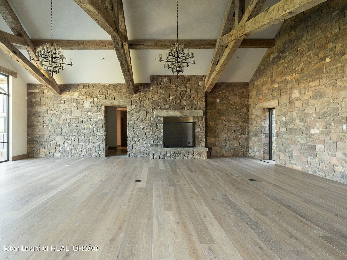 This expansive living room blends rustic charm with modern elegance. A warm wooden ceiling with exposed beams adds character, while the stone wall creates a stunning focal point. The open layout offers flexibility for family gatherings, providing ample space for furniture arrangement. Large windows invite natural light, enhancing the inviting atmosphere. The pale hardwood flooring complements the earthy tones of the stone, creating a cozy yet sophisticated feel. Stylish chandeliers suspend above, adding a touch of elegance. A sleek, built-in fireplace promises warmth and comfort, making this a perfect gathering spot for family and friends.