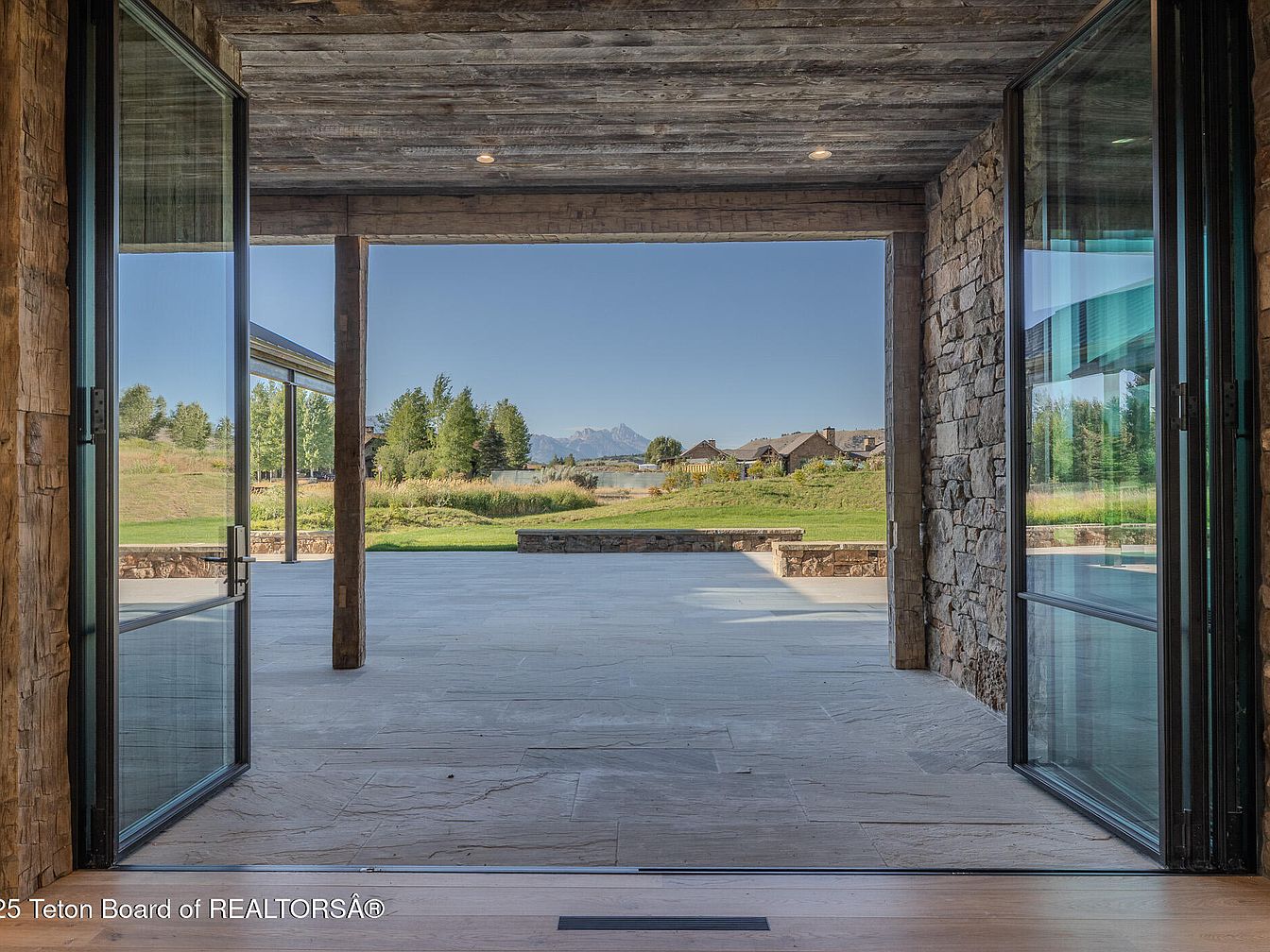 Welcoming outdoor entrance showcases a seamless blend of indoor and outdoor living. Large glass doors open to a spacious patio, featuring elegant stonework and polished surfaces that invite natural light and connect the home to its serene surroundings. The earthy tones of the exposed wooden beams and stone provide a rustic charm, while the contemporary design elements give it a modern appeal. Family-friendly features, such as easy access to the expansive lawn and unobstructed views of the mountains, create a perfect setting for gatherings and relaxation. This entrance is designed for both comfort and style.