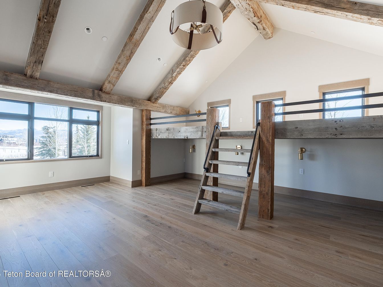 This spacious loft boasts soaring ceilings enhanced by rustic wooden beams that create an inviting atmosphere. Large windows flood the area with natural light and offer breathtaking views of the surrounding landscape. The lightweight wooden staircase leads to an elevated sleeping area, perfect for accommodating guests or creating an enchanting playroom for children. A warm, neutral color palette accentuates the natural wood elements, while sleek accents add a modern touch. The open layout encourages family interaction and creates a versatile space for relaxation, making it an ideal setting for cultivating cherished memories.