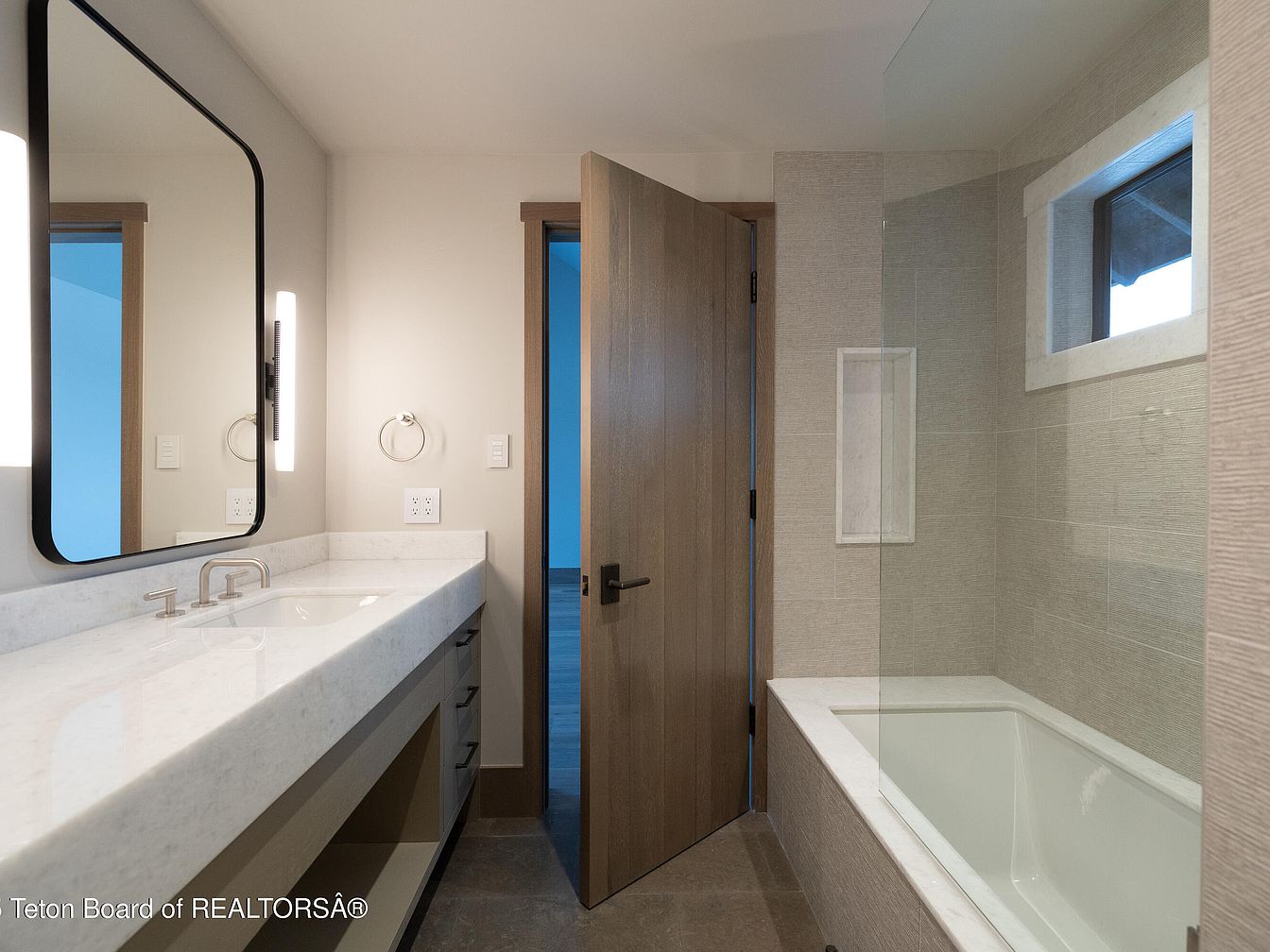 This contemporary bathroom space combines functionality with sleek aesthetics. The spacious layout features a double sink vanity with a polished marble countertop, complemented by warm wood cabinetry for ample storage. Elegant curved mirrors enhance the modern feel, reflecting light from stylish wall sconces. The neutral color palette, primarily soft grays and whites, creates a calming atmosphere. A glass shower enclosure and a deep soaking tub invite relaxation, while the strategically placed window allows natural light, showcasing the minimalist tile work. With thoughtful design elements, this bathroom balances style and practicality for everyday use.