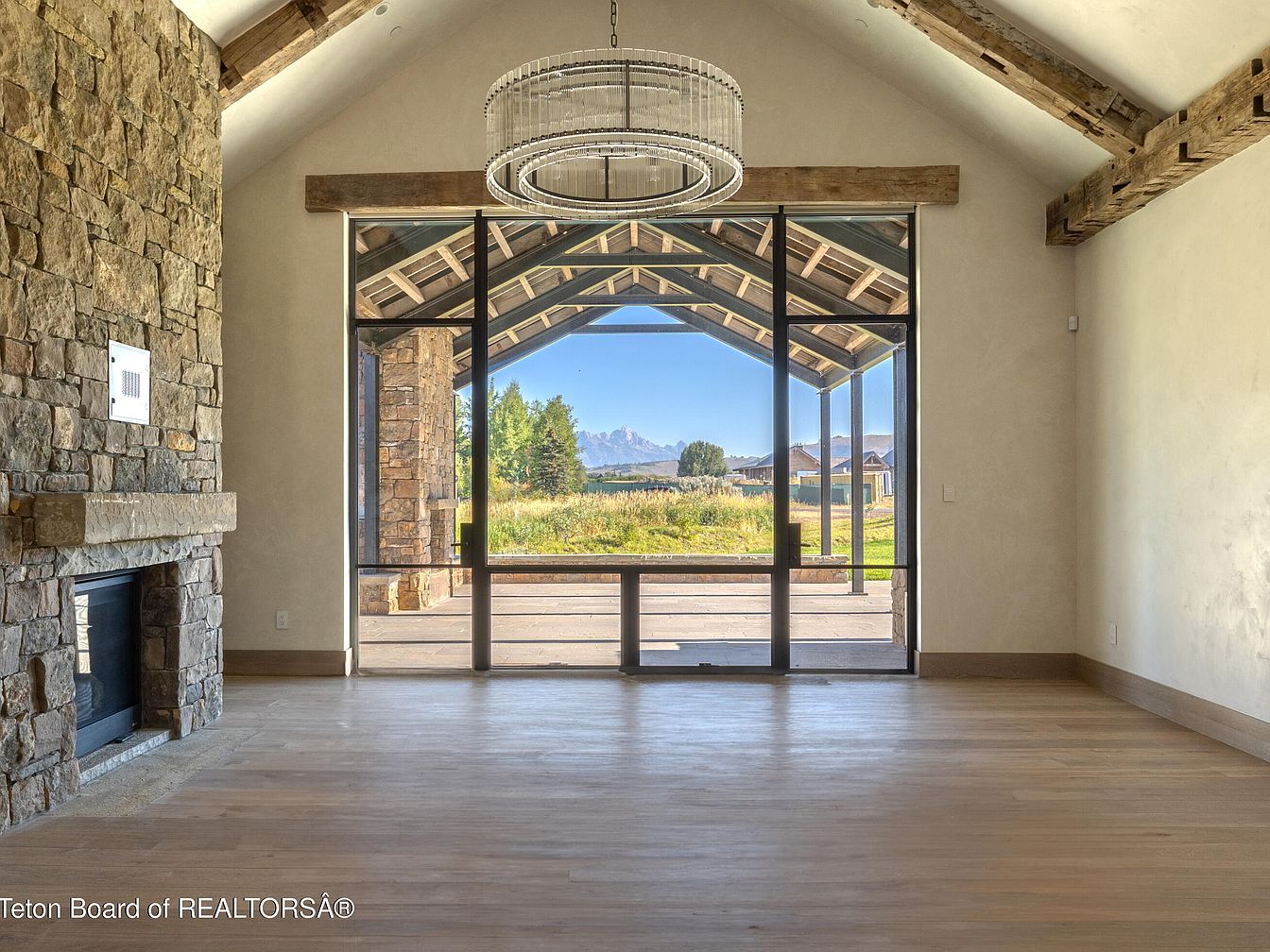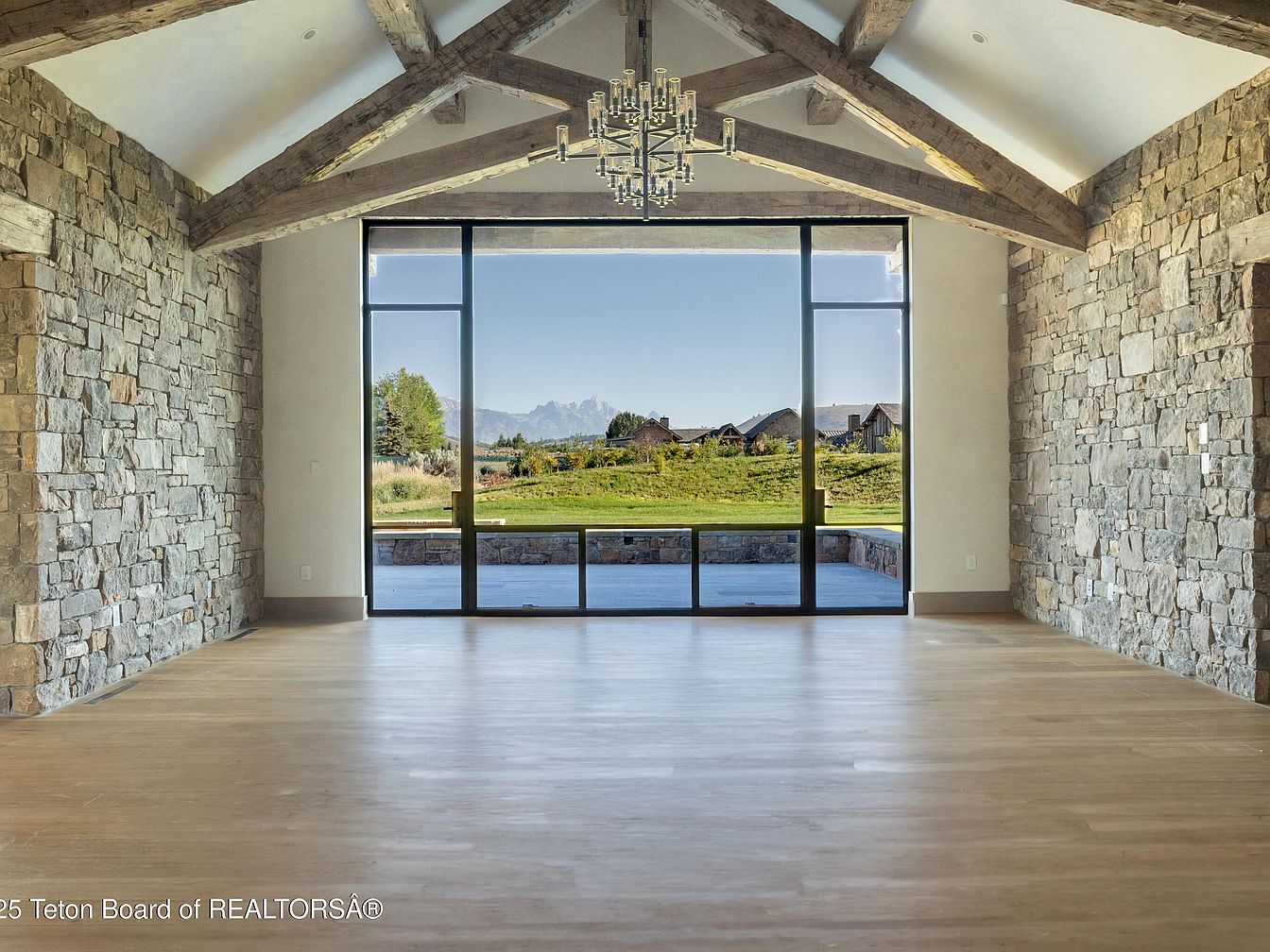 This spacious living room exudes modern elegance with its combination of stone walls and exposed wooden beams. The large glass windows frame a breathtaking view of rolling landscapes, inviting natural light to flood the space. The neutral color palette of light wood flooring complements the textured stone, creating a harmonious and warm atmosphere. Family-friendly features include ample open space for gatherings and activities, making it ideal for entertaining. The sophisticated chandelier adds a touch of luxury, while the overall layout fosters a seamless connection between indoor comfort and outdoor beauty, perfect for tranquil living.
