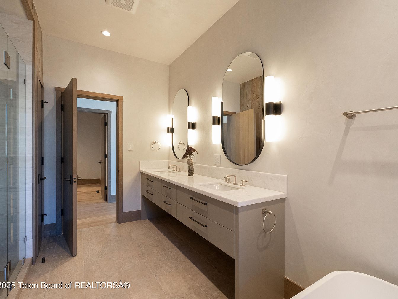 This expansive master bathroom features a sleek, contemporary design with a neutral color palette that emphasizes tranquility. Dual sinks positioned beneath large, oval mirrors are flanked by modern sconces, creating an elegant touch. The spacious vanity offers ample storage, while the polished countertop complements the textured walls that evoke sophistication. A walk-in shower and a freestanding tub enhance the spa-like atmosphere, perfect for relaxation. Warm wooden accents, seen in the door frames and flooring, add warmth and a family-friendly appeal, making this an inviting space for everyday use. Thoughtful lighting enhances functionality and style.