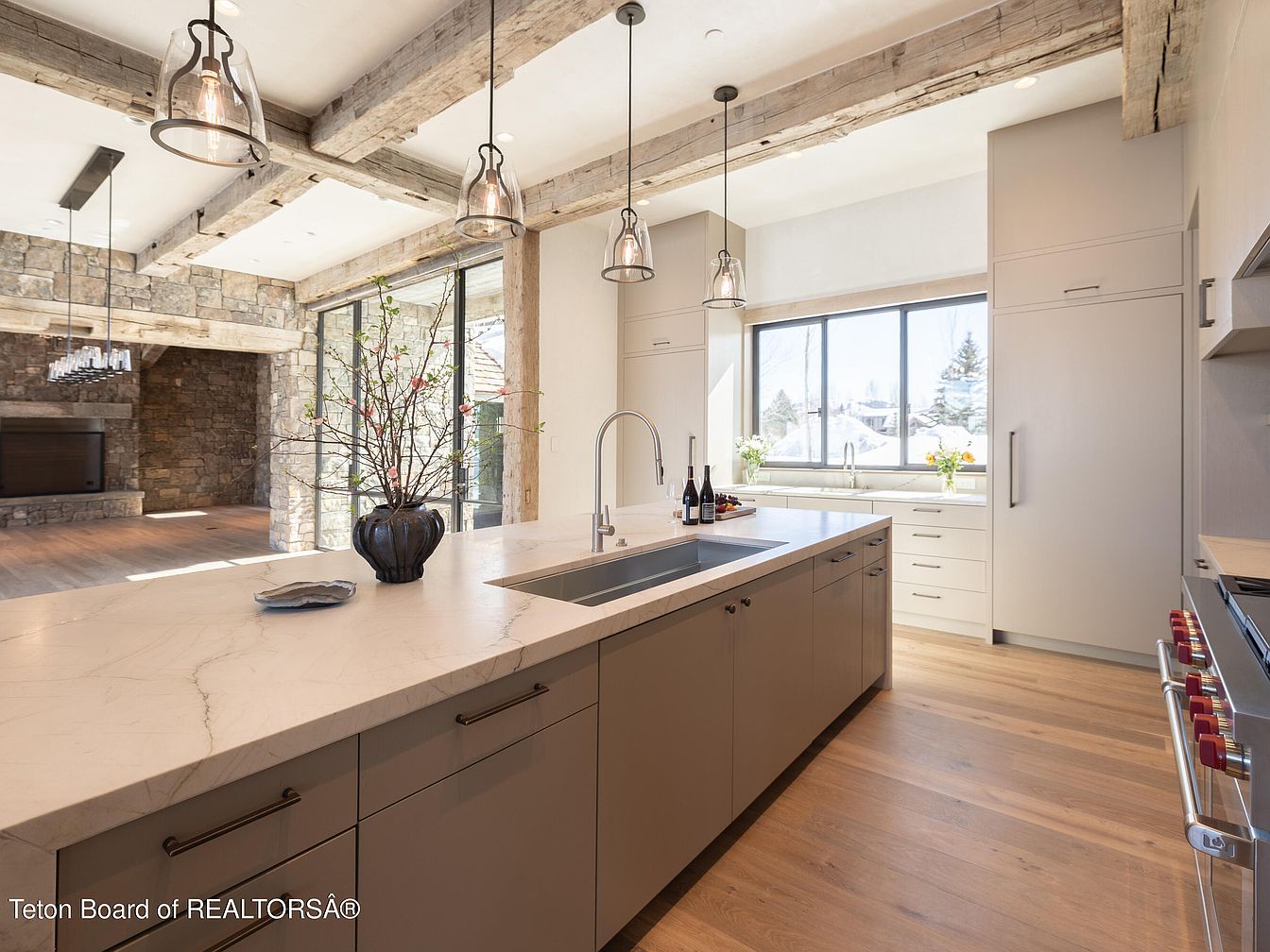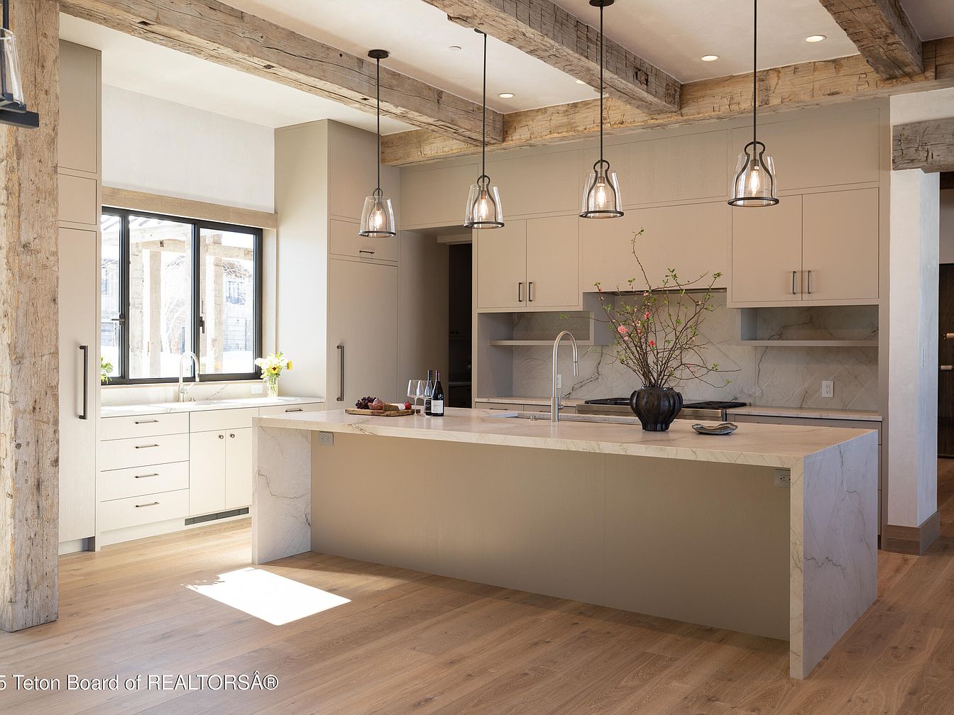 This sleek kitchen combines modern aesthetics with functional elements for a family-friendly environment. The spacious layout features a large island, topped with elegant marble, providing ample prep space and storage. Light beige cabinetry complements the natural wood beams overhead, adding warmth and character. Large windows invite sunlight, brightening the room and offering serene views. Thoughtfully designed lighting fixtures hang above the island, enhancing the inviting atmosphere. Practical elements include easy-to-reach cabinets and an integrated sink, ensuring efficiency in meal preparation. Carefully chosen decor, like fresh flowers in a vase, adds a personal touch to this stylish culinary space.