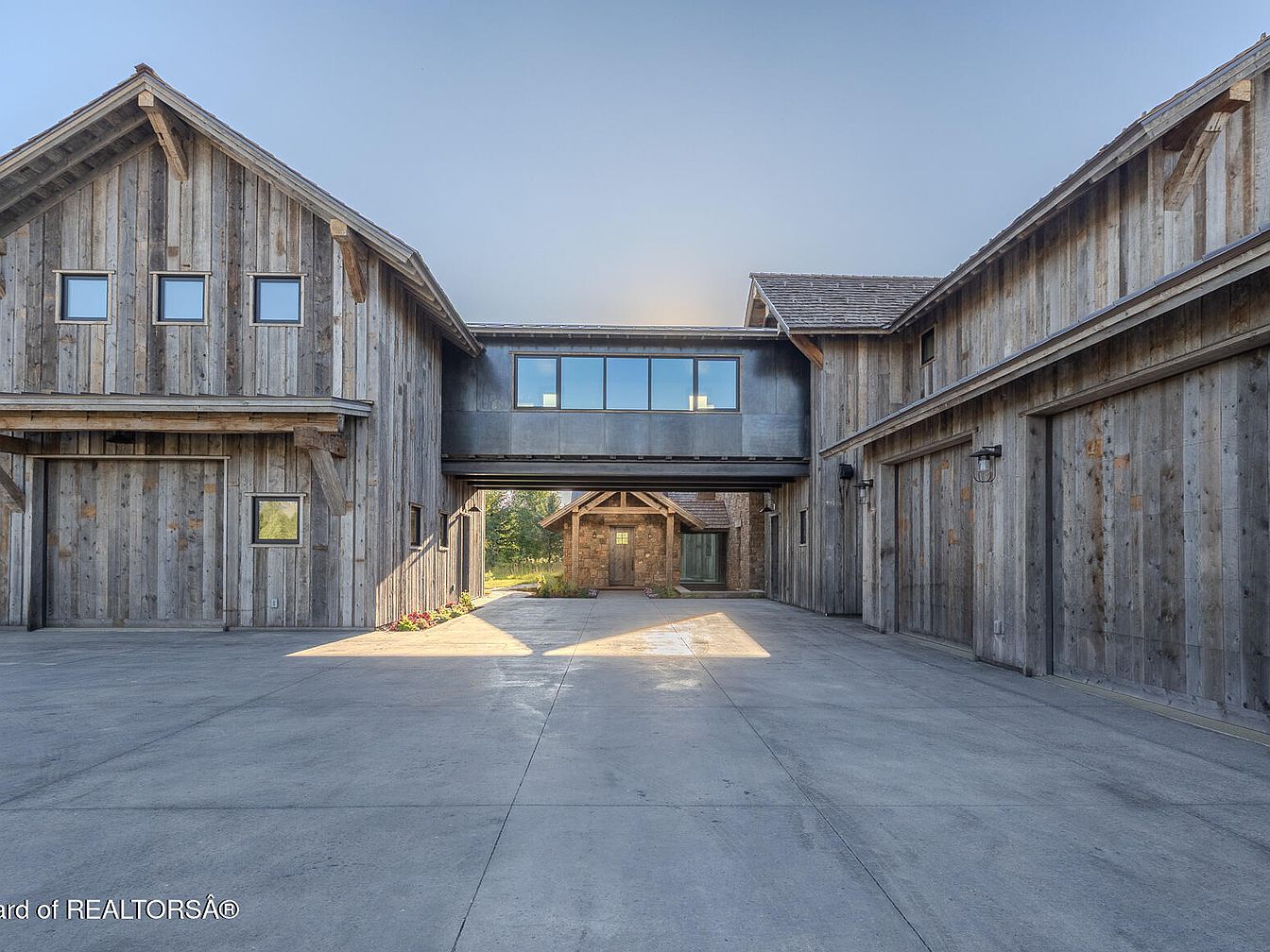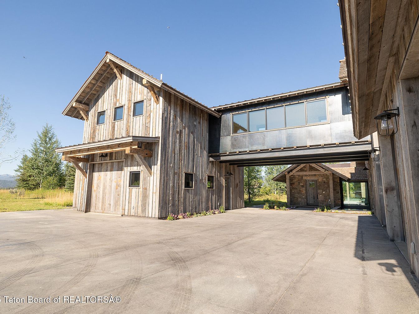 This garage entrance showcases a modern rustic aesthetic, blending natural wood with contemporary design elements. The striking use of weathered wooden planks provides warmth, while the sleek metal accents add a sophisticated touch. The large, shining pathway is spacious enough for family activities and parking, accommodating multiple vehicles effortlessly. The towering structure features large windows that invite abundant natural light, fostering an open and airy atmosphere. Symmetrical garage doors complement the overall design, ensuring functionality meets style. Thoughtfully positioned landscaping enhances the entrance, offering a welcoming transition from outdoor to indoor living.