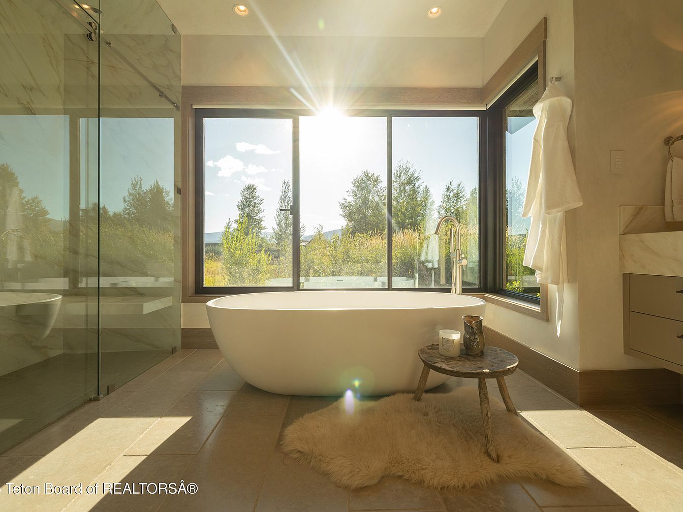 This luxurious bathroom offers a serene retreat, featuring floor-to-ceiling windows that showcase breathtaking views of the outdoors. A sculptural freestanding tub sits elegantly beneath natural light, inviting relaxation. The space is designed with a neutral color palette, accented by warm wood tones and soft textures. A minimalist vanity complements the modern aesthetic, while a plush rug adds comfort. The open layout ensures a spacious feel, enhancing family-friendly functionality. Architectural details such as recessed lighting and sleek glass shower enclosures create a contemporary ambiance, making this bathroom a perfect blend of elegance and practicality.