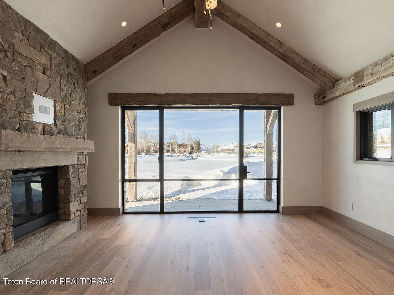 This living room combines rustic charm with modern elegance, featuring exposed wooden beams and a striking stone fireplace that serves as a focal point. The space is filled with natural light from expansive floor-to-ceiling windows, offering breathtaking views of the snowy landscape outside. The warm wood tones of the flooring complement the soft color palette of the walls, creating a cozy yet spacious atmosphere. A minimalist design ensures an uncluttered feel, perfect for family gatherings. The layout facilitates movement and interaction, making it an ideal hub for relaxation and entertaining guests.