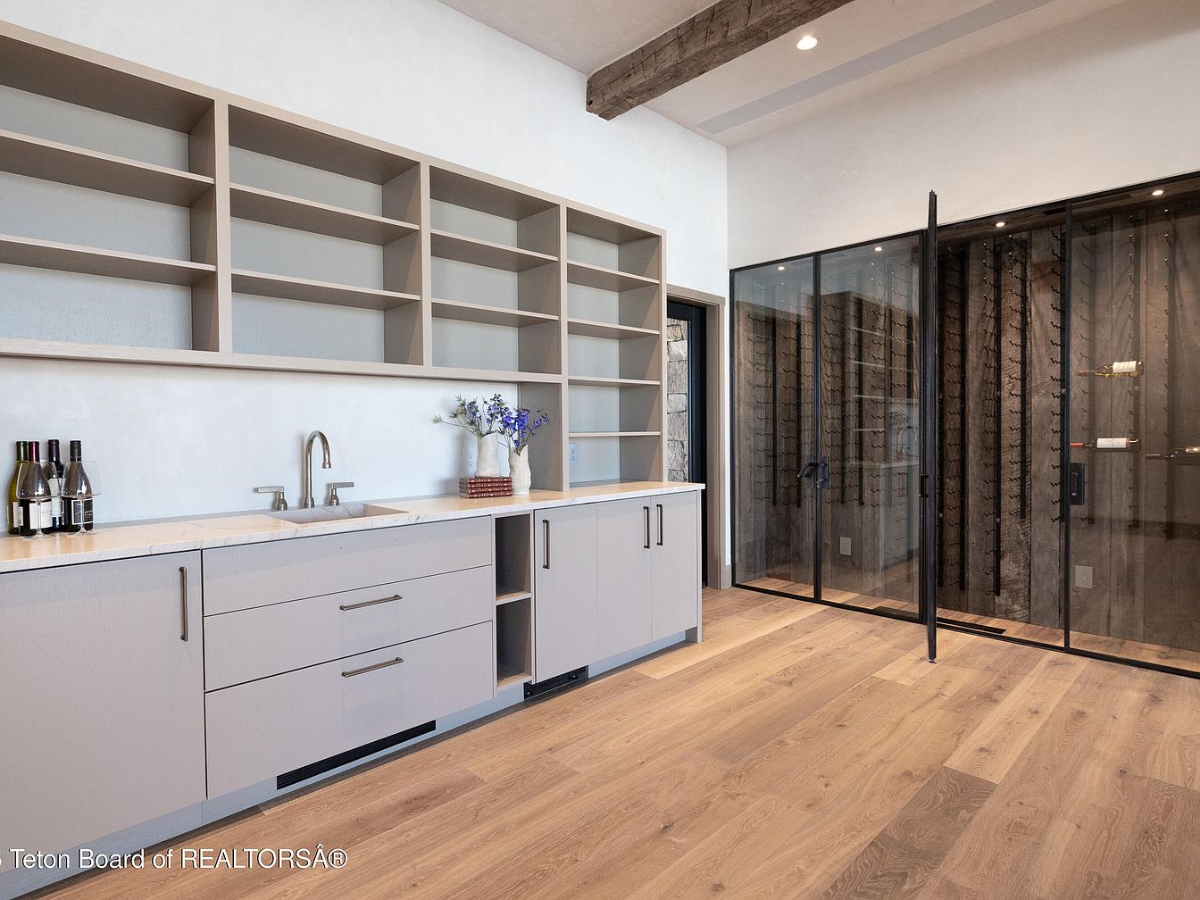 A modern wine cellar entry showcases a seamless blend of functionality and elegance, designed for enthusiasts and social gatherings. The spacious area features sleek, light gray cabinetry providing ample storage and a contemporary feel. A polished marble countertop complements the cabinetry, while the open shelving offers a perfect display for bottles and decorative items. Completed with a stylish sink, the area is ideal for entertaining. The striking glass doors lead into the wine cellar, featuring dark stone walls lined with wine racks, creating an inviting atmosphere. Warm wood flooring enhances the cozy yet sophisticated ambiance.