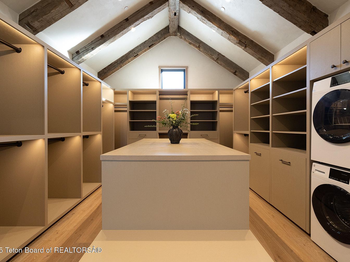 This expansive laundry room features a modern and functional design, highlighted by a central island that doubles as a folding station. The warm, neutral color palette, dominated by soft beiges and natural wood tones, creates an inviting atmosphere. Ample cabinetry and built-in shelves offer generous storage, while the exposed wooden beams add character and a touch of rustic charm. Energy-efficient washer and dryer appliances are neatly integrated, ensuring convenience. Thoughtfully placed lighting enhances the space, making it bright and airy, perfect for managing household tasks efficiently in a family-friendly environment.