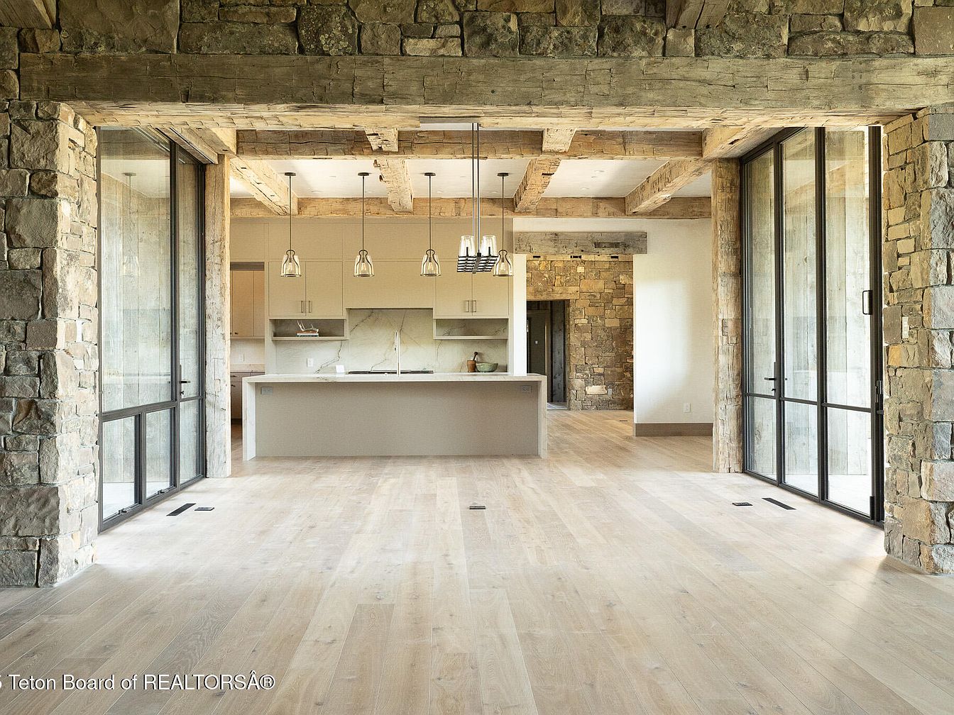 This open concept living space integrates the kitchen and dining area seamlessly, showcasing a harmonious blend of rustic and modern aesthetics. Exposed wooden beams and stone accents bring warmth and texture, while the light hardwood flooring creates a sense of continuity. The kitchen features sleek, minimalist cabinetry with a subtle color palette, accented by stylish pendant lights hanging gracefully over the island. Ample natural light floods through expansive glass doors, leading to an outdoor space, making it ideal for family gatherings. This thoughtfully designed area promotes both functionality and an inviting atmosphere, perfect for everyday living.