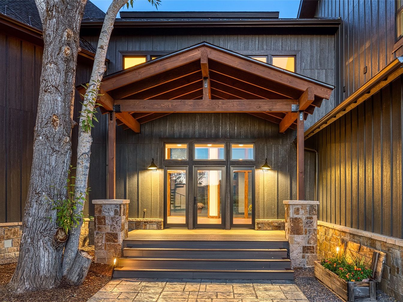 Featuring a welcoming entryway, this American home combines modern aesthetics with rustic charm. The gabled porch, supported by sturdy wooden beams, invites guests with its warm, inviting atmosphere. A blend of dark siding and light stone accents enhances the façade’s visual appeal. The large glass doors allow natural light to flood the interior, serving as a transition space that balances functionality and beauty. The tiered steps lead gracefully to the doorway, framed by tasteful landscaping that includes vibrant flowers and mulch. Subtle exterior lighting highlights the architectural features, contributing to an enchanting evening ambiance.