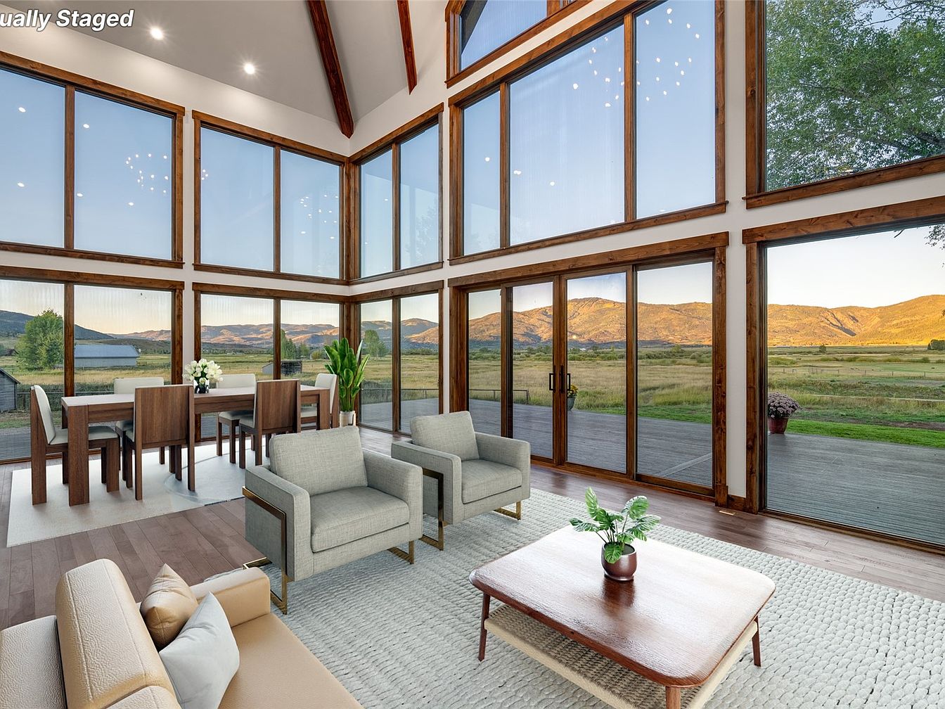 This stunning living area features expansive floor-to-ceiling windows, inviting natural light while offering breathtaking views of the surrounding landscape. The open layout seamlessly integrates the dining and lounging areas, fostering a sense of togetherness. A neutral color palette of soft grays and warm wood tones complements the modern furnishings, including sleek chairs and a stylish coffee table. Architectural details, such as exposed wooden beams, enhance the rustic charm. Family-friendly elements include ample seating and a spacious area for kids to play or gather with friends, making this space a perfect haven for relaxation and socializing.