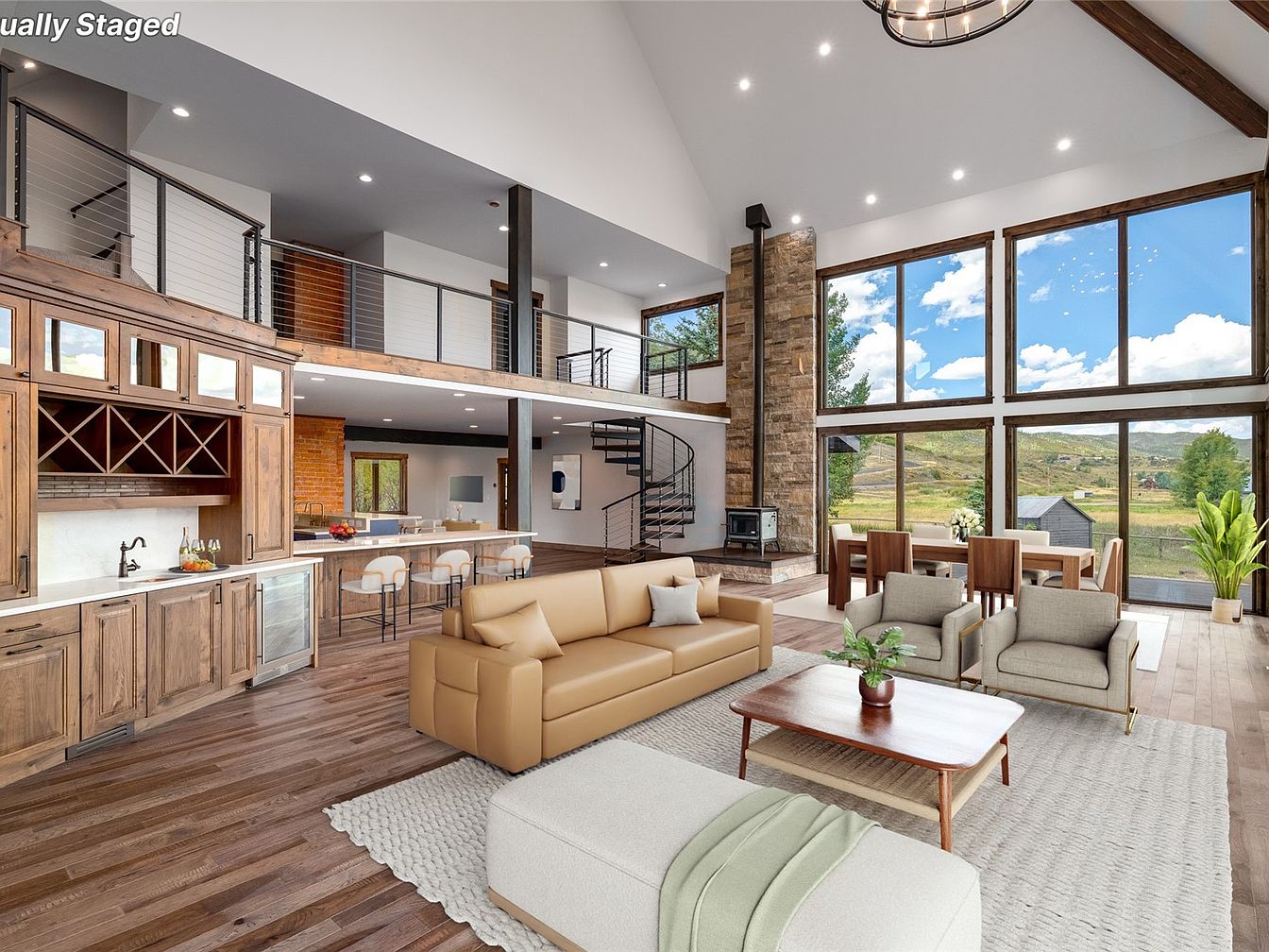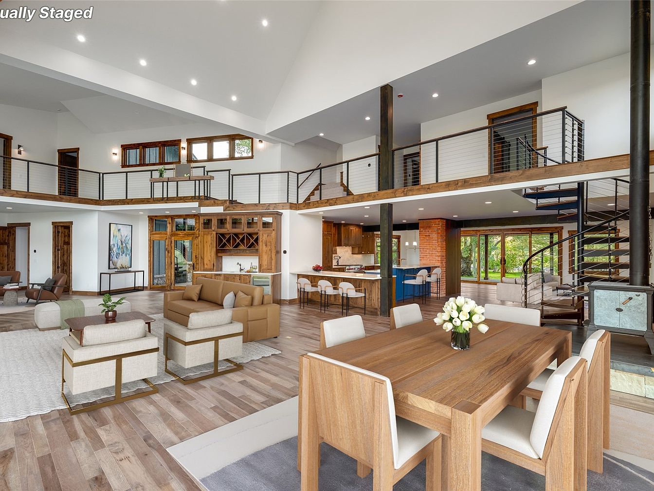 This expansive open-concept living area merges sophistication with comfort, featuring soaring ceilings and a modern aesthetic. Natural light floods through large windows, illuminating the warm wood accents and contemporary furnishings. The inviting seating arrangement includes a plush sectional and elegant armchairs, arranged for relaxation and conversation. A stylish dining table, crafted from rich wood, is perfect for family gatherings. The kitchen boasts sleek cabinetry and an island with bar seating, enhancing functionality. Architectural elements, like the spiral staircase and exposed beams, add character, while strategically placed greenery breathes life into the space, creating a serene, inviting atmosphere.