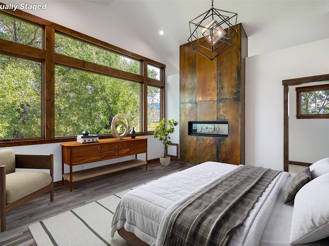 This master bedroom features expansive windows that invite natural light and showcase a beautiful view of surrounding greenery. The warm wood accents, from the sleek furniture to the striking feature wall, create a harmonious atmosphere. A cozy bed adorned with soft linens and textured throw blankets adds inviting comfort, while the mid-century modern nightstands provide stylish functionality. A geometric pendant light enhances the room’s contemporary feel, and the fireplace with a minimalist design adds an element of warmth and serenity. The subtle color scheme, combined with earthy tones, fosters a relaxing sanctuary tailored for family living.