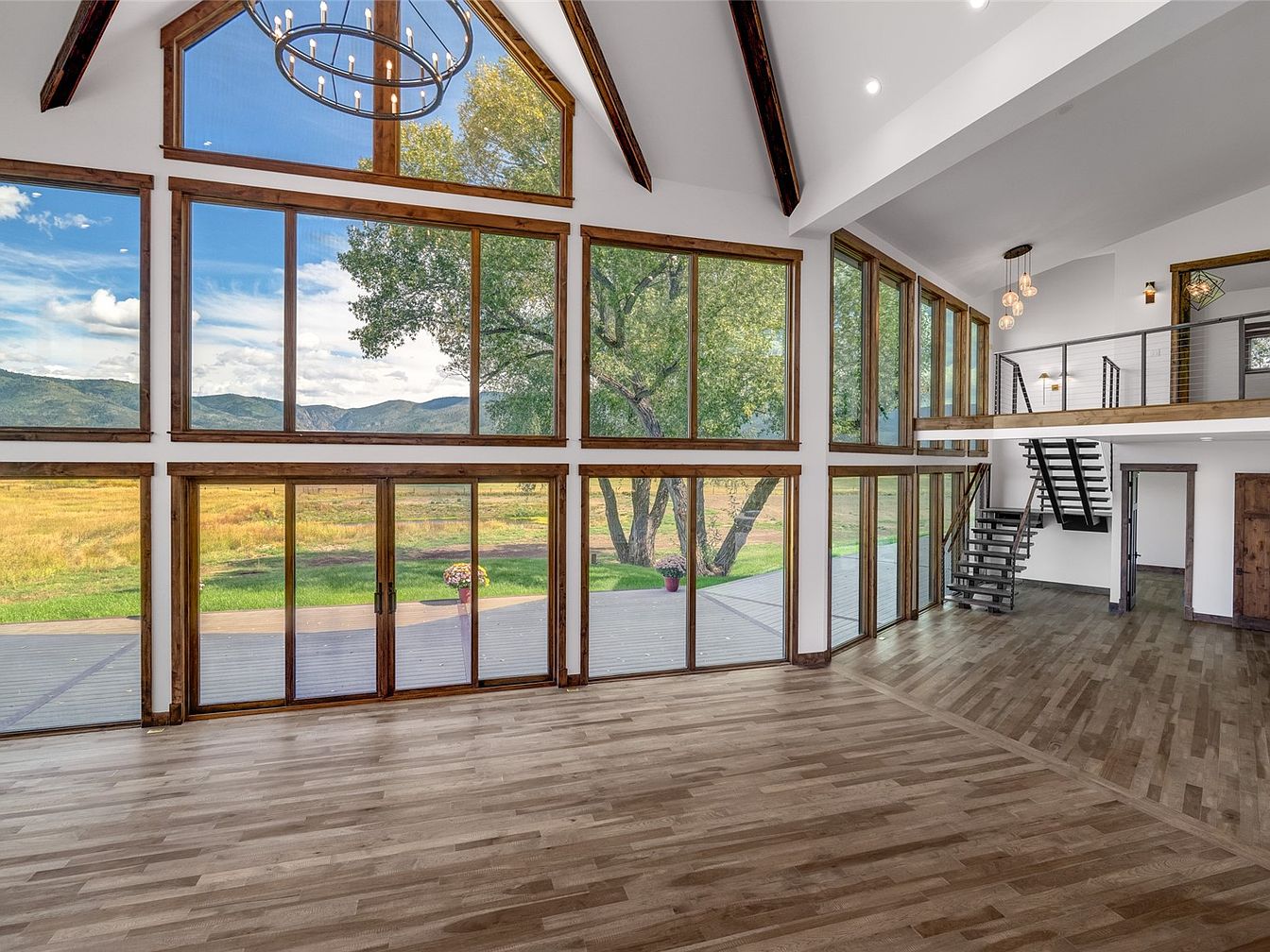 This stunning open living space merges modern design with nature, featuring expansive floor-to-ceiling windows that invite panoramic views of the landscape. The interior boasts a warm, neutral color palette, complemented by rich wooden beams and trim that enhance the rustic appeal. The spacious layout provides ample room for family gatherings, while the durable, light-toned hardwood flooring adds elegance and practicality. A spacious staircase leads to an upper level, enhancing the home’s verticality and whimsy. Soft lighting fixtures offer a contemporary touch, creating a welcoming atmosphere perfect for relaxation and entertainment.