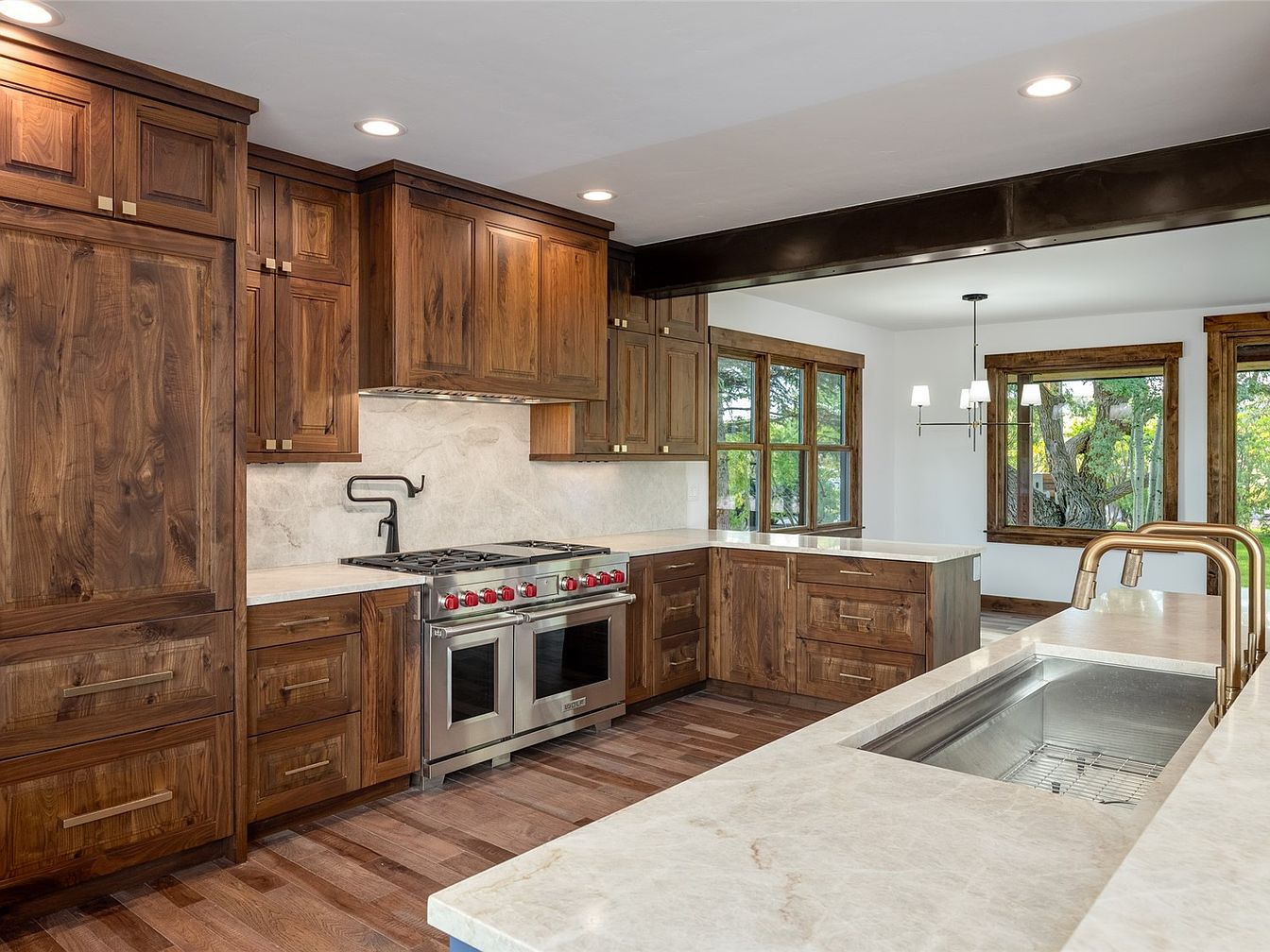 This modern kitchen showcases beautifully crafted wooden cabinetry that combines functionality and warmth, featuring a rich walnut finish. The layout is spacious, enhancing family interaction with an open plan connecting to dining areas. Light beige quartz countertops provide a stunning contrast against the dark wood, while the professional-grade stainless steel appliances—including a six-burner range—highlight culinary capabilities. Ample natural light streams through large windows, complemented by stylish light fixtures that add a contemporary touch. The hardwood flooring ties the space together, offering a cozy yet elegant ambiance ideal for family gatherings and culinary creativity.
