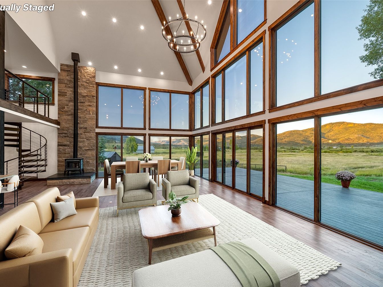 This inviting living area features soaring ceilings and expansive windows that flood the space with natural light, creating a warm and airy ambiance. The neutral color palette, highlighted by earth-toned furnishings, promotes a sense of tranquility and comfort. A stylish spiral staircase leads to an upper level, enhancing the home’s openness. The sleek stone fireplace serves as a focal point, providing both elegance and warmth on cooler evenings. Comfortable seating arrangements, alongside a contemporary dining area, make this the perfect space for family gatherings. Large glass doors extend the living area outdoors, inviting breathtaking views and seamless indoor-outdoor living.