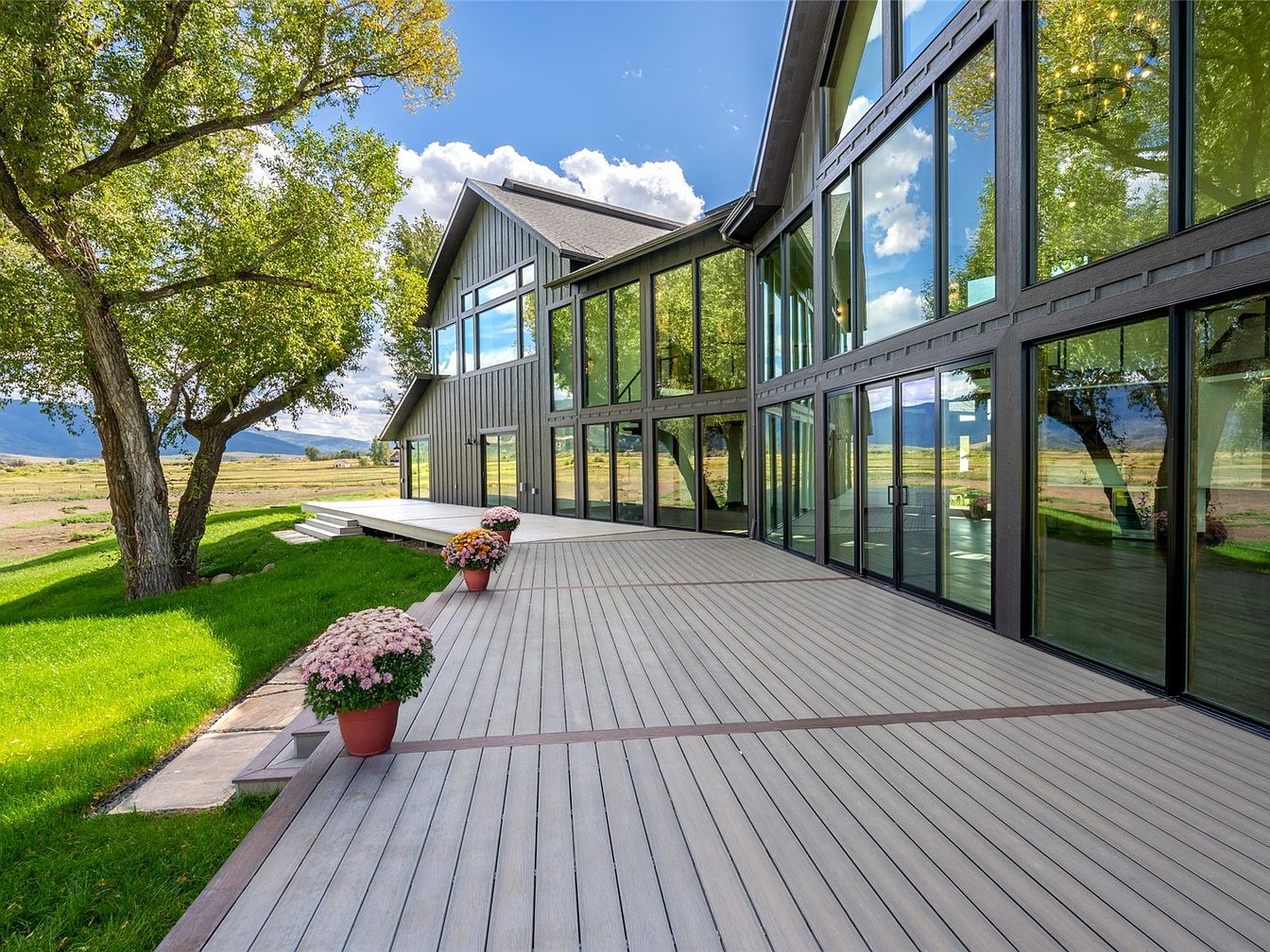 This stunning patio entrance features a sleek, modern design with expansive glass walls that reflect the surrounding landscape. The large, airy space is crafted for seamless indoor-outdoor living, perfect for entertaining family and friends. The textured wooden decking adds warmth, complemented by vibrant potted flowers that bring a pop of color to the serene green surroundings. The architectural lines of the house, paired with the large trees nearby, create a harmonious blend with nature. This thoughtfully designed area invites natural light, enhancing the spacious feel and providing breathtaking views of the expansive outdoor scenery.