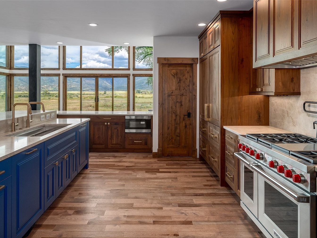 This kitchen features a harmonious blend of modern aesthetics and rustic charm. The striking blue cabinetry contrasts beautifully with rich wooden accents, creating an inviting atmosphere. Equipped with state-of-the-art appliances, including a high-end gas range with vibrant red knobs, it’s perfect for family cooking adventures. Ample natural light floods the space through expansive windows, offering breathtaking views of the outdoors, while the warm wood flooring enhances the overall comfort. Thoughtful details such as a sleek, minimalistic countertop and gold hardware add elegance, making it a practical and stylish centerpiece for family gatherings and culinary creativity.