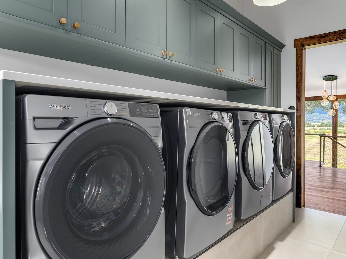 This inviting laundry room blends functionality with stylish design. Equipped with modern, front-loading machines, the space features a minimalist layout with sleek, gray cabinetry that adds a contemporary touch. Light green cabinets with gold hardware provide a warm contrast, while the long countertop offers ample space for folding clothes. Natural light floods in through large windows, enhancing the airy feel and connecting the interior with the beautiful outdoor scenery. The seamless integration of wood accents and the open layout creates a family-friendly environment, making chores more enjoyable while keeping everything organized and accessible.