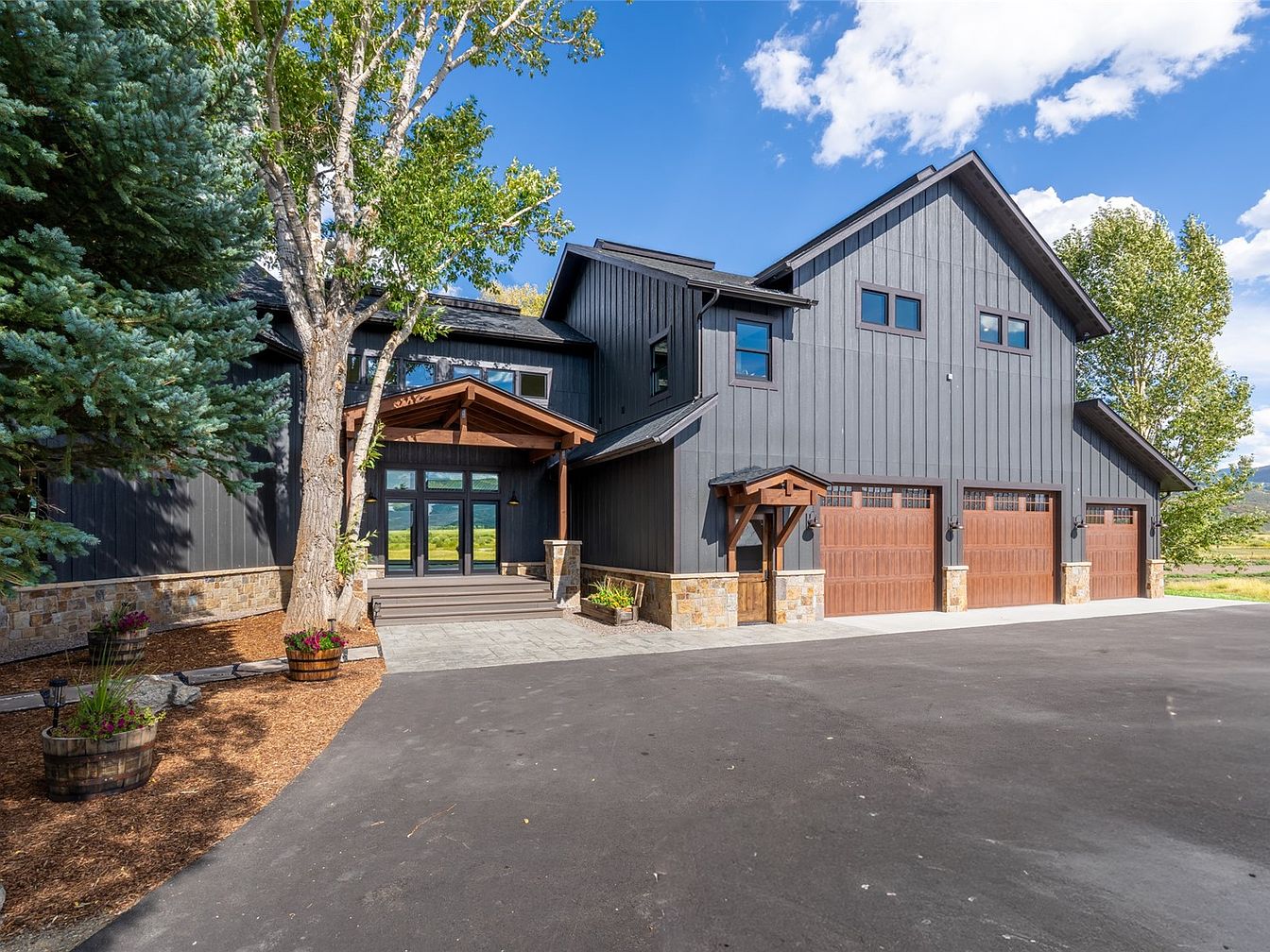 Nestled in a picturesque landscape, this charming country home features a modern gray exterior complemented by a sleek metal roof. Large windows invite natural light, enhancing the inviting atmosphere. The spacious gravel driveway accommodates family gatherings and visitors, while lush greenery and flowering plants add a vibrant touch. A rustic wooden wagon wheel accentuates the outdoor charm, inviting exploration of the expansive grounds. The home’s layout ensures practicality and comfort, making it perfect for family living. With serene mountain views and ample outdoor space, this residence blends elegance and functionality, ideal for creating memorable moments.