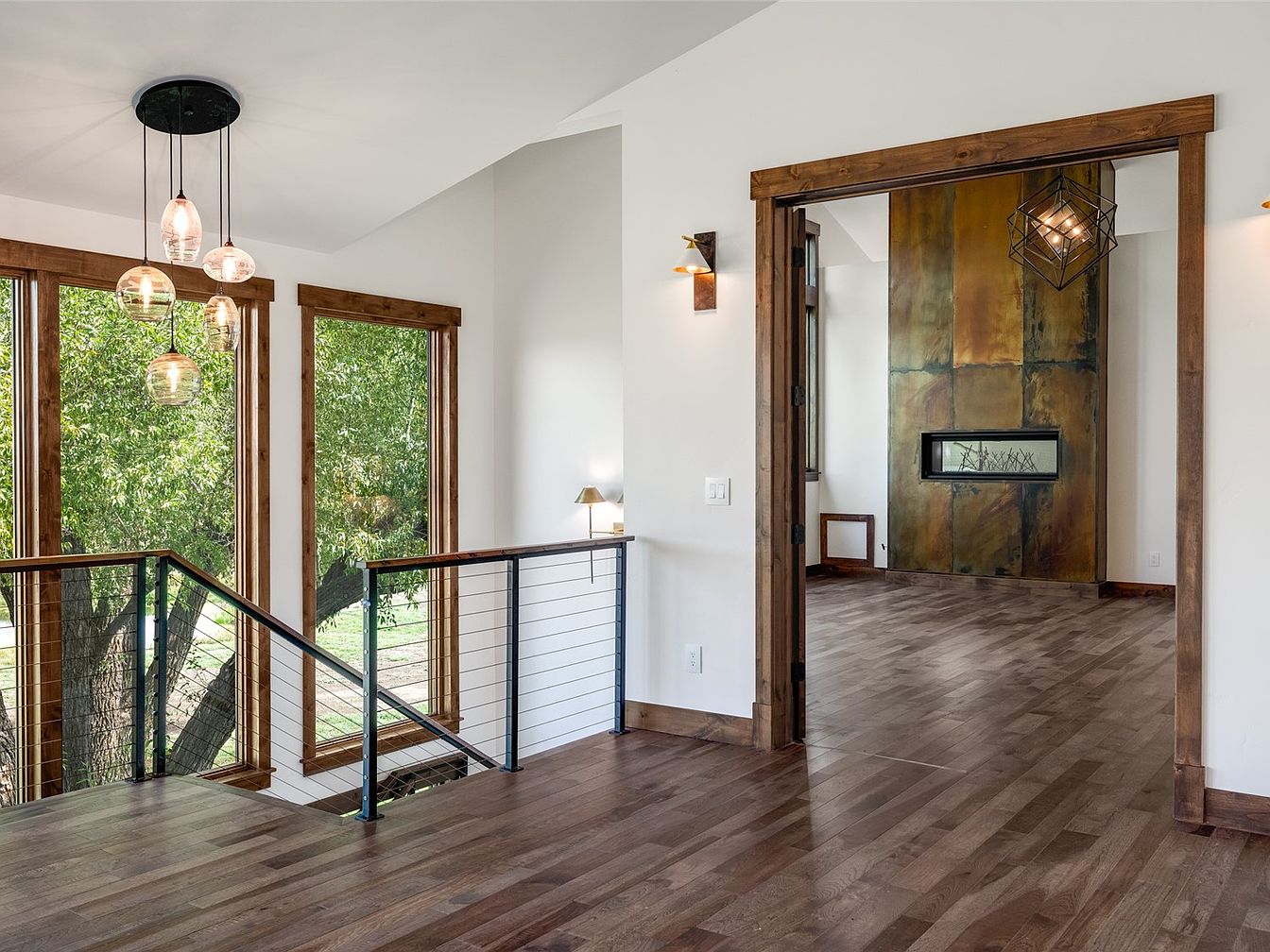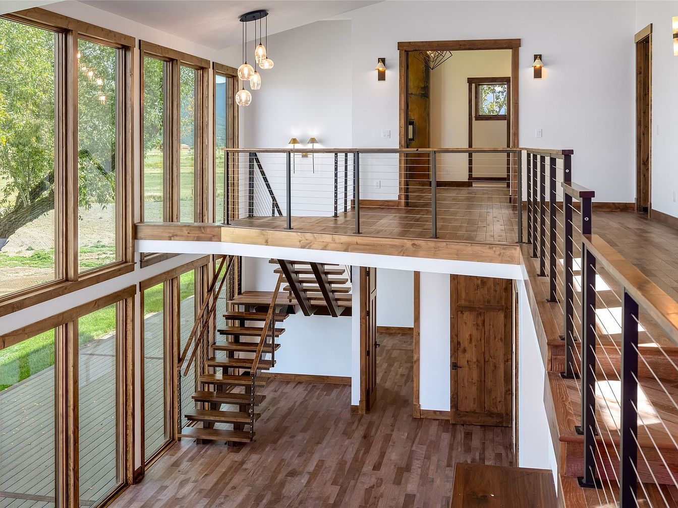 This multi-level living area showcases a blend of modern and rustic design, featuring expansive windows that flood the space with natural light. The open floor plan creates a welcoming atmosphere, connecting the upper balcony to the lower level. A stunning wooden staircase with sleek metal railings draws the eye and enhances the contemporary aesthetic. Rich wooden floors complement the neutral walls, while warm pendant lighting adds a cozy touch. Family-friendly elements, like spacious communal areas and functional layouts, provide versatility for various activities, making this space an ideal foundation for family living and entertaining.