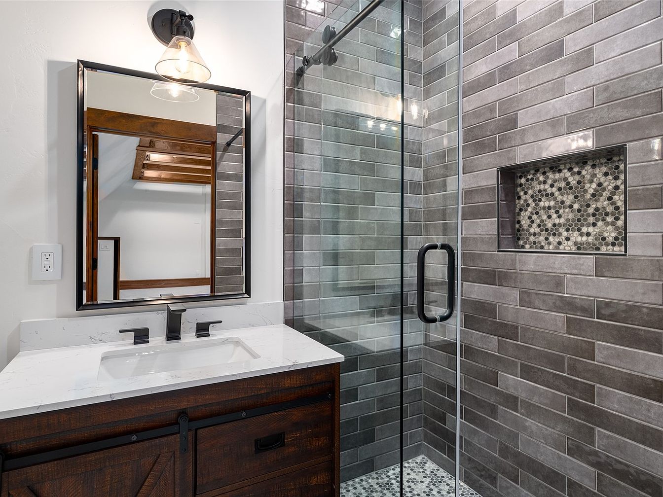 This bathroom encapsulates modern elegance with its sleek layout and thoughtful design. The combination of rich, dark wood cabinetry and pristine white marble countertop creates a striking contrast. A spacious walk-in shower features contemporary gray tiles, complemented by a decorative mosaic niche, adding visual interest. The black fixtures lend a sophisticated touch, while the chic glass enclosure visually expands the space, bathing it in natural light. Ambient lighting from the wall sconce enhances the warm atmosphere, making it a perfect family-friendly retreat. Every detail contributes to a serene yet functional environment ideal for everyday relaxation.