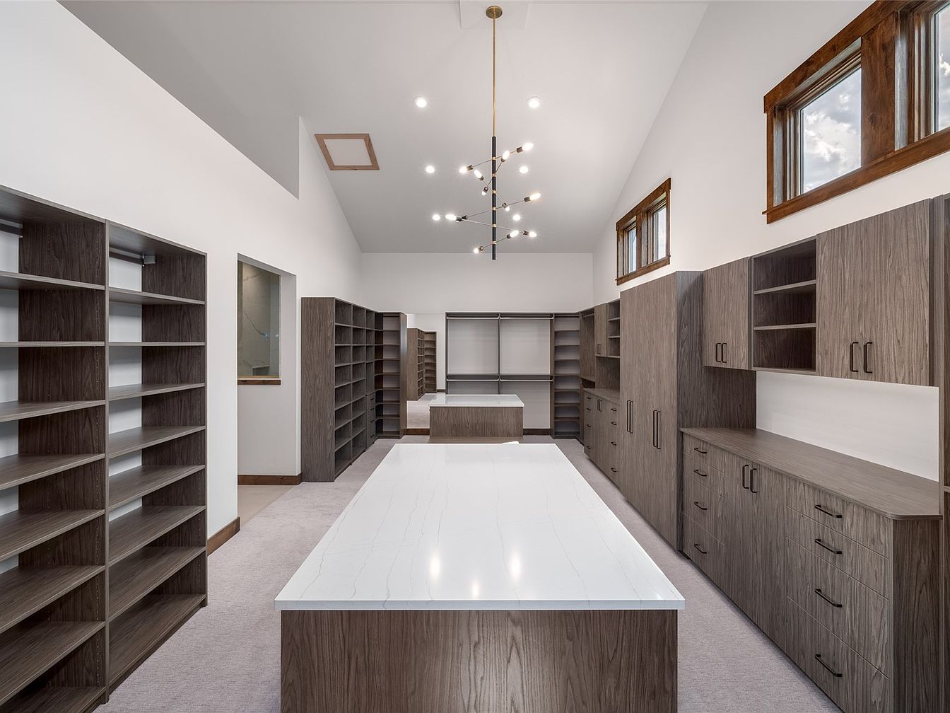 This impressive walk-in closet features a modern design with a high, vaulted ceiling that enhances the spaciousness. Dark wood cabinetry contrasts beautifully with the light neutral walls, creating a warm yet contemporary atmosphere. An oversized island with a sleek white countertop provides ample space for organizing personal items or displaying accessories. The clever layout includes numerous shelves and storage units, ensuring everything is easily accessible. Large windows allow natural light to flood the space, enhancing its inviting nature. Thoughtful touches like subtle lighting fixtures and soft carpeting add to the closet’s family-friendly elegance.