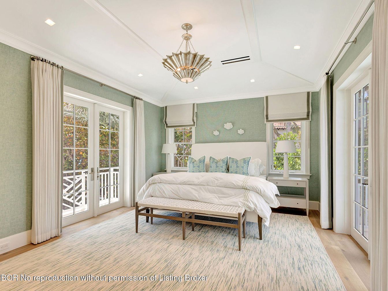 This tranquil master bedroom exudes serenity with its soft blue-green wallpaper and bright, airy feel. Large windows framed by elegant drapes invite natural light, enhancing the spacious layout. A plush king-size bed, adorned with decorative pillows, serves as the focal point, complemented by a stylish bench at the foot. Architectural details like crown molding and recessed lighting add sophistication. A sleek nightstand and modern lamp provide functional elegance, while the patterned area rug unifies the space, adding warmth. Ideal for relaxation, this family-friendly retreat features calming aesthetics, promoting comfort and peacefulness, perfect for unwinding after a long day.