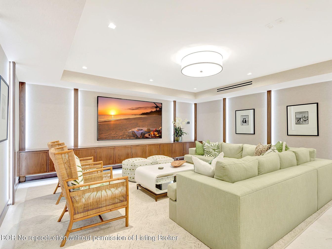 This modern living room blends comfort with style, featuring a large, plush, light green sectional that invites relaxation. A pair of stylish rattan chairs complete the seating arrangement, enhancing the space’s airy feel. The room boasts a cohesive neutral color palette, accented by green throw pillows and artful decor, including framed photographs on the walls. A sleek, circular chandelier hangs elegantly from the ceiling, while a mounted television serves as a focal point, showcasing serene beach scenes. Natural light floods in, complemented by soft lighting from hidden fixtures, creating a warm, inviting atmosphere ideal for family gatherings.