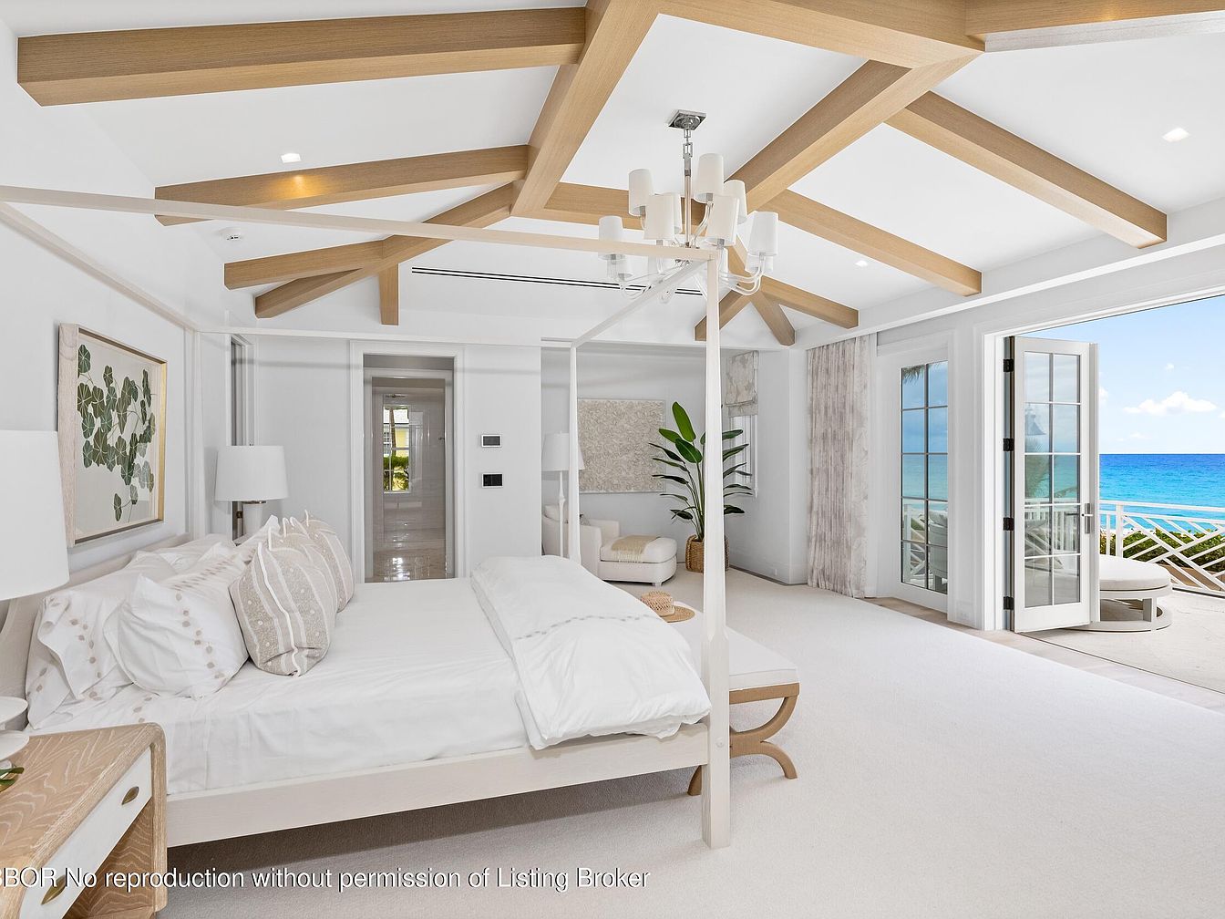 This luxurious master bedroom features soaring, exposed wooden beams, enhancing the airy ambiance. Soft white walls create a serene backdrop, complemented by plush carpeting that invites barefoot comfort. A plush four-poster bed, adorned with decorative pillows, promises restful nights. Light streams in through expansive glass doors, leading to a picturesque balcony overlooking the ocean, a perfect spot for morning coffee. Two stylish bedside lamps add a warm glow, while modern artwork adds a personal touch. The space is designed with family-friendly features, ensuring safety and accessibility, making it an ideal retreat for relaxation and rejuvenation.