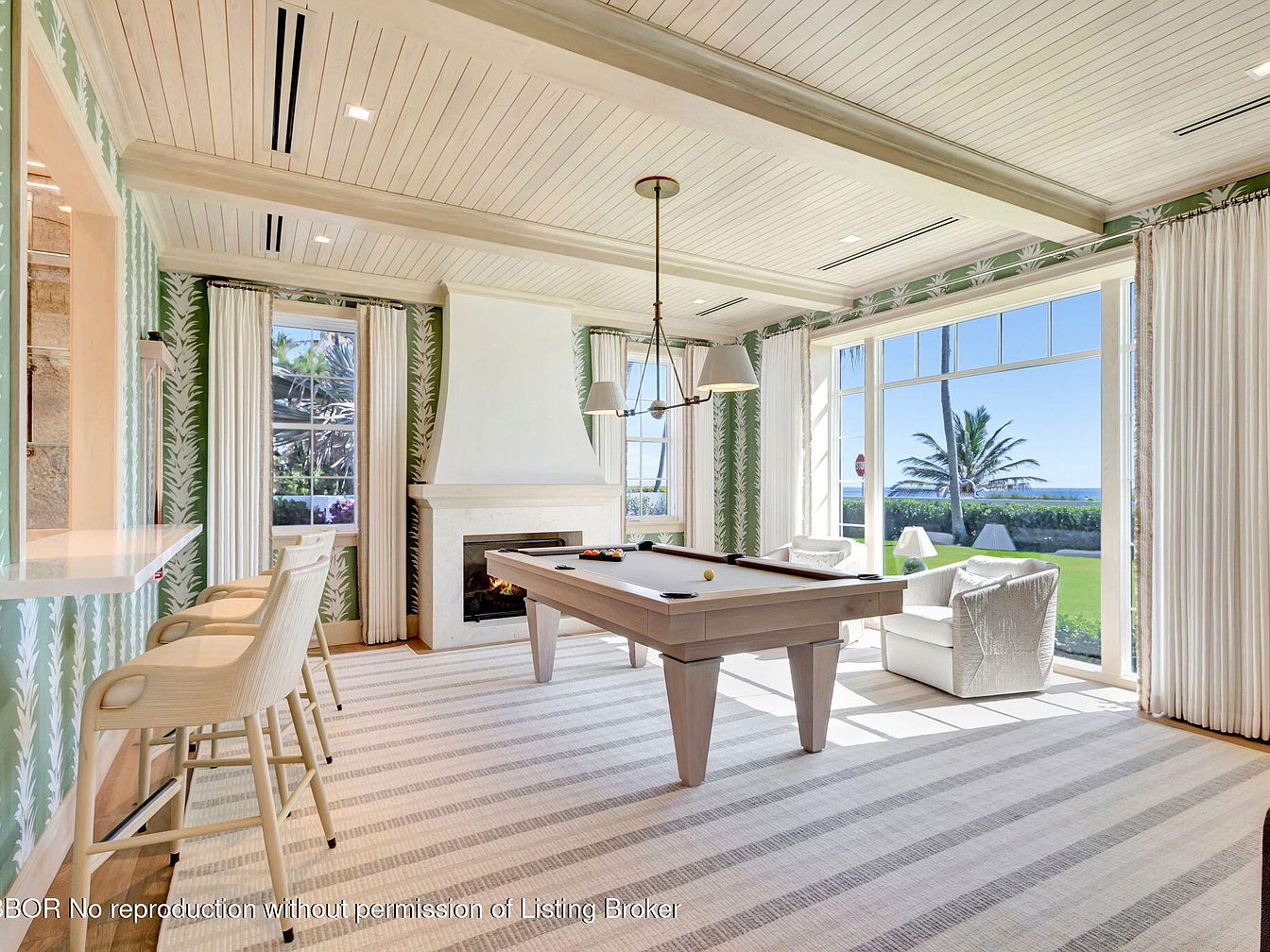 This inviting game room features a stylish pool table as its centerpiece, surrounded by a serene color scheme of soft whites and greens. The wall displays a chic botanical print, enhancing the room’s tropical vibe. Ample natural light floods the space through expansive windows, offering stunning views of palm trees and the outdoors. A cozy seating area beside the fireplace invites relaxation, while modern barstools at the nearby counter provide a casual dining option. The combination of elegant architectural details like the wood-beamed ceiling and plush furnishings renders this space perfect for family gatherings and entertaining.