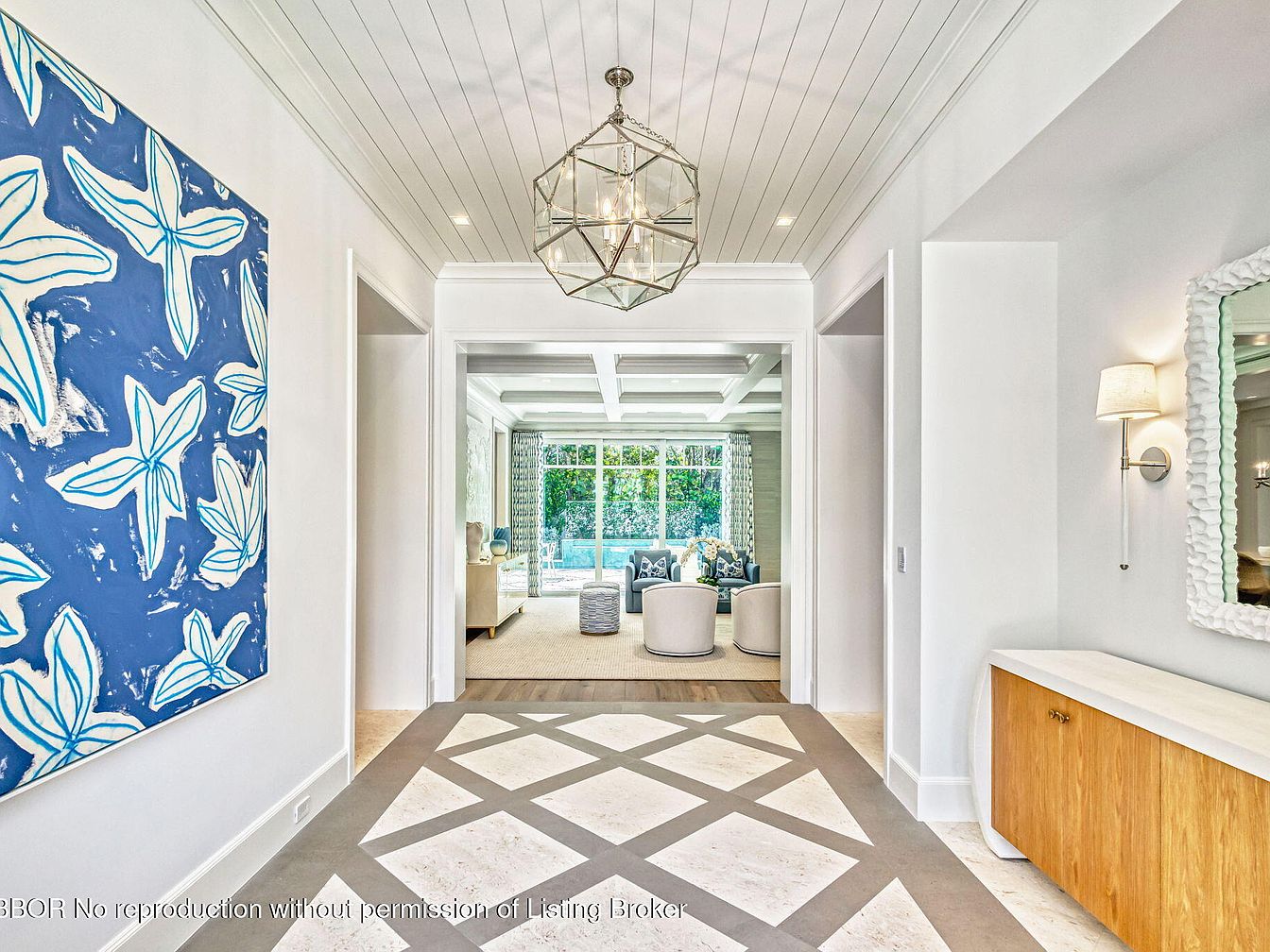 A beautifully designed entryway highlights the essence of modern living, featuring a striking blue and white artwork that complements the neutral color palette. The high, coffered ceiling enhances the open feel, while the geometric patterned floor adds a contemporary touch. This family-oriented space promotes warmth and togetherness, with soft lighting fixtures and a elegant mirror reflecting light. An inviting wooden sideboard offers practical storage while contributing to the room’s aesthetic harmony. A glimpse of the spacious living area through the archway reveals cozy seating, perfect for gatherings. This entryway seamlessly invites family and guests into a stylish home.