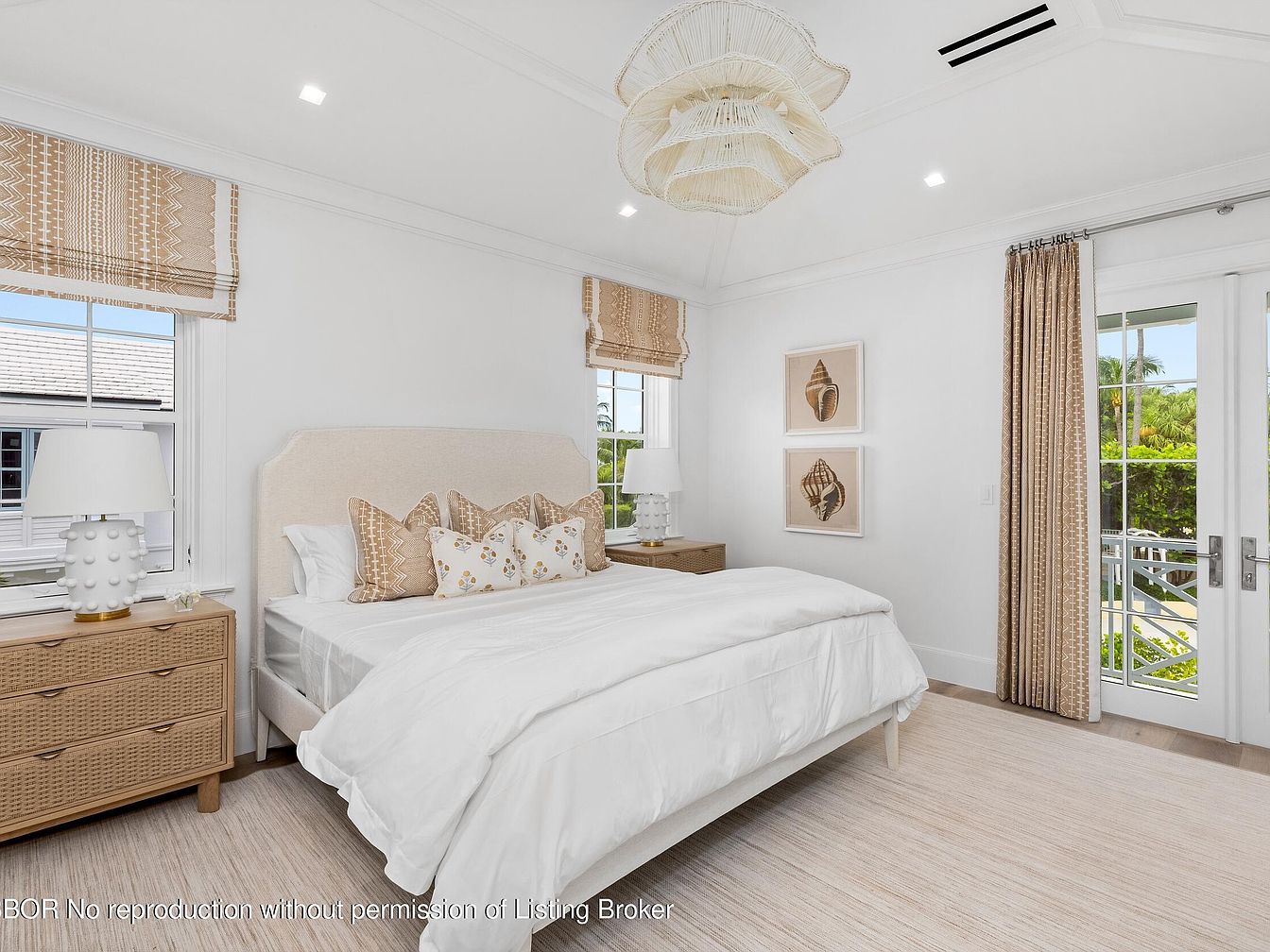 This serene master bedroom exudes a coastal charm with its airy design and soothing color palette. The layout features a plush, upholstered bed flanked by textured nightstands, one adorned with a stylish lamp, enhancing the room’s cozy feel. Soft beige tones dominate the space, complemented by natural light streaming through large windows. Classy drapes add elegance, while the woven pendant light overhead contributes to the relaxed atmosphere. Decor elements like shell art further emphasize the beachy vibe. Ideal for families, the room offers ample space and tranquility, making it a perfect retreat for rest and relaxation.
